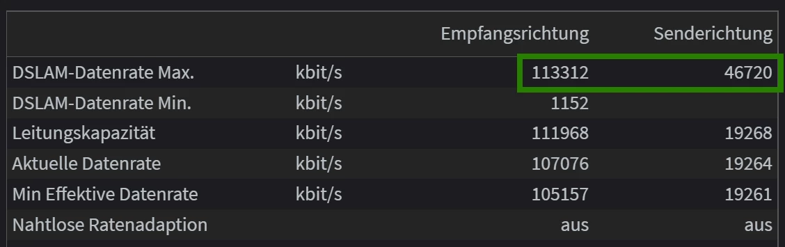 Jedoch ist die alte DSLAM-Rate wieder da, siehe Bildschirmausschnitt.