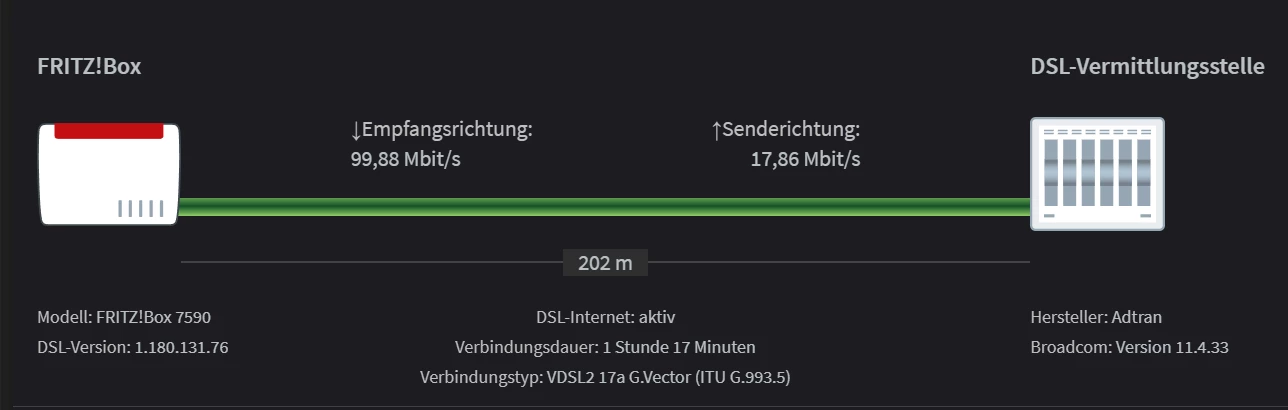An welcher Linecard bist du nun angeschlossen? Nach wie vor einer Adtran Broadcom 11.4.33, die nur VDSL bis 100 MBit/s kann, oder hat sich da was geändert?