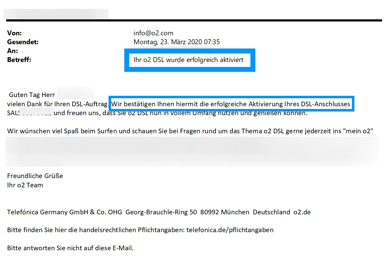 In diesem Kommentar dann noch die Auftragsbestätigung vom 06.03.2020 zum Tarifwechsel von 50 auf 100 Mbit/s, im nächsten Kommentar die Bestätigung zur erfolgreichen Freischaltung für 100/40 und im Sommer diese Jahres dieser Spaß unbekannt, ungeklärt, vorüber war, der Grund für diesen Verlauf hier …