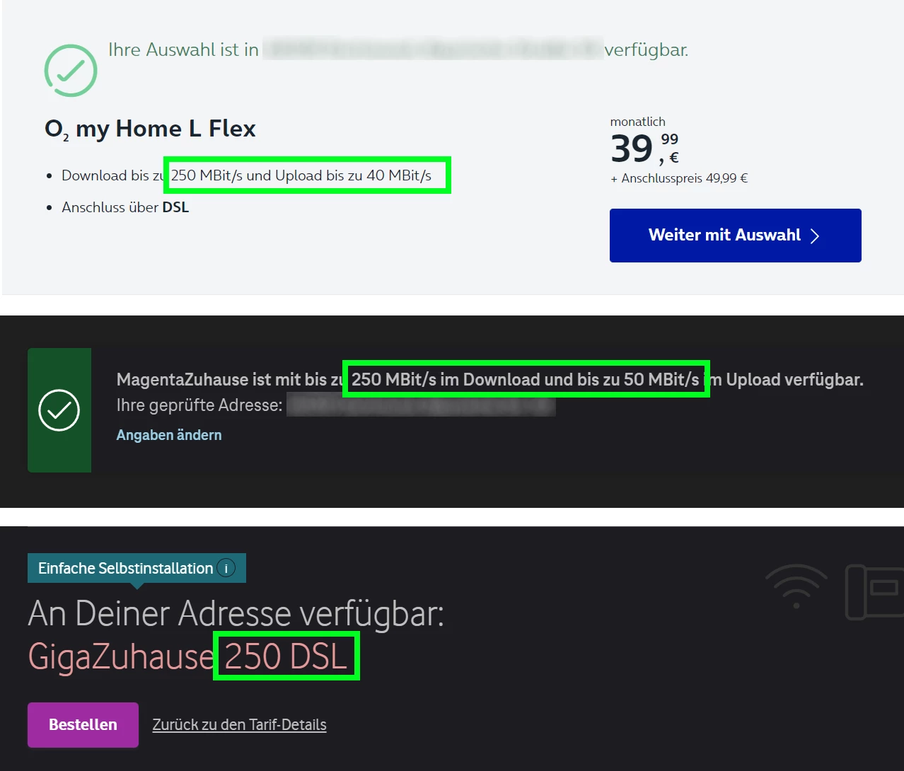 Bei anderen Anbietern, auch bei der verantwortlichen Telekom😉, ergibt die Verfügbarkeitsprüfung auch die 250 MBit, jedoch, wie wir wissen, nicht in der Praxis.