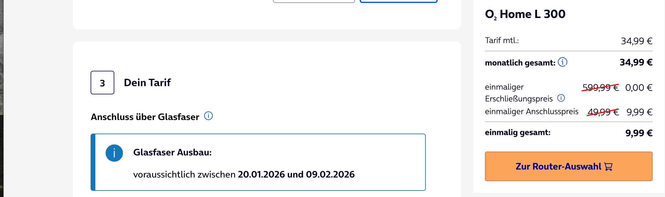 Bei der Online-Bestellung wird mir jedoch eine Glasfaser-Erschließungsgebühr in Höhe von 599 € angezeigt. Diese wird zwar im weiteren Verlauf auf 0 € gesetzt, dennoch verunsichert mich dieser Hinweis.