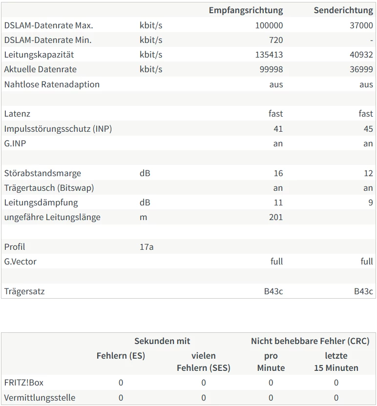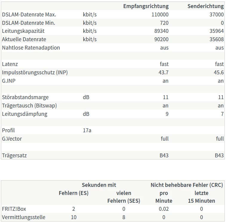 Nun wurde der DSLAM am 17.10.19 mit Super Vectoring (Broadcom 193.218) aufgerüstet, wodurch ich mit der alten Fritzbox (7390) vorerst ein paar Verbindungsabbrüche hatte, die ich aber dadurch lösen konnte, indem ich die Einstellungen unter “Störsicherheit“ alle auf “maximale Stabilität” gestellt habe.