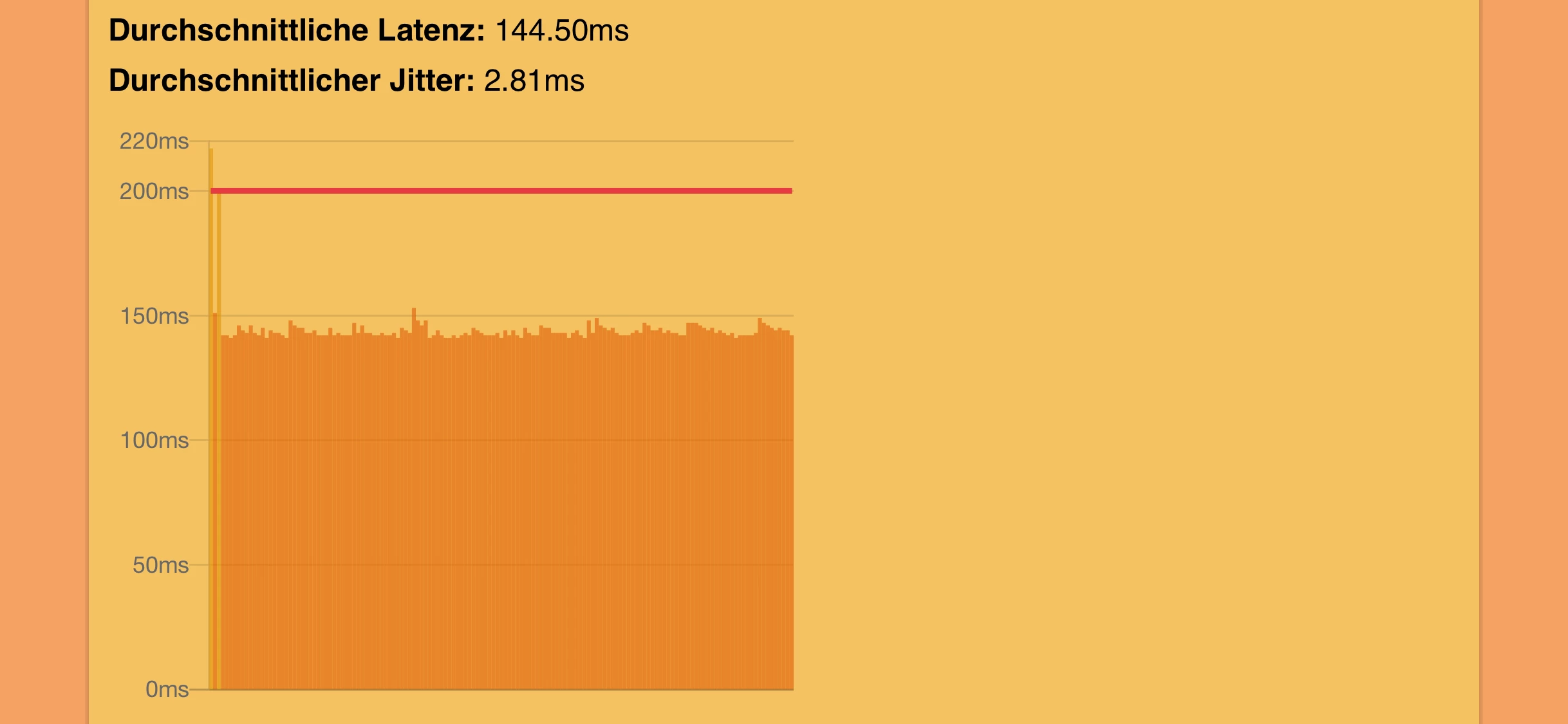 Seit Monaten (Anfang März) habe ich Latenzen von bis zu 250ms. Diese Latenzzeit ist extrem instabil, sie schwankt zwischen 120ms und peakt unregelmäßig auf bis zu 250ms. Nach Anruf des o2-Services kam nach einem Tag eine SMS, dass kein Problem vorliegen würde und die Latenz sich im Toleranzbereich befinden würde.