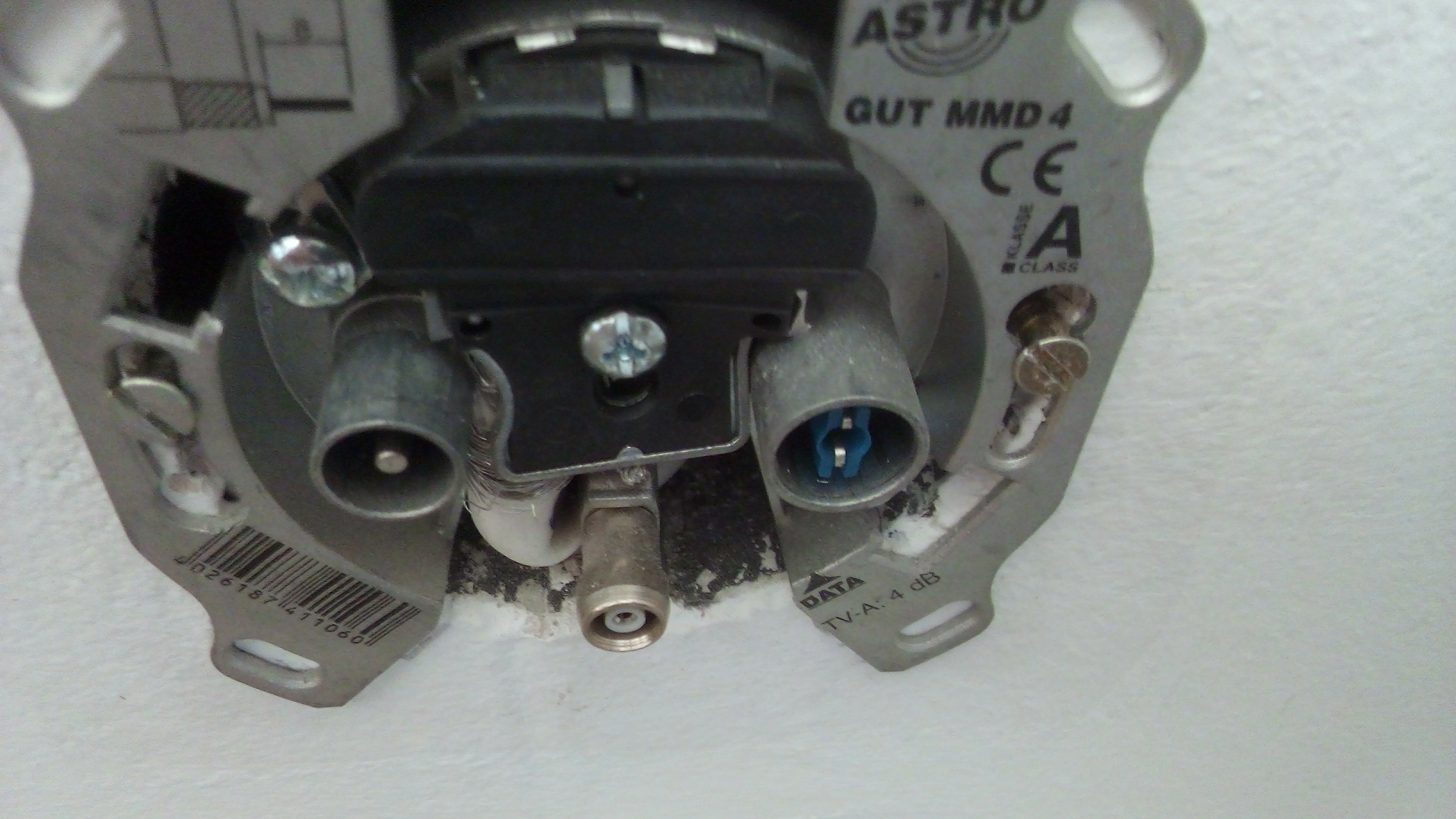Der Sat Anschluss oben ist aber auch mit einer Blende verschlossen. Der untere Anschluss hat, bei meinem Glück, natürlich keine Beschriftung. Die anderen beiden links und rechts haben sinngemäß TV und Radio als Beschriftung.
