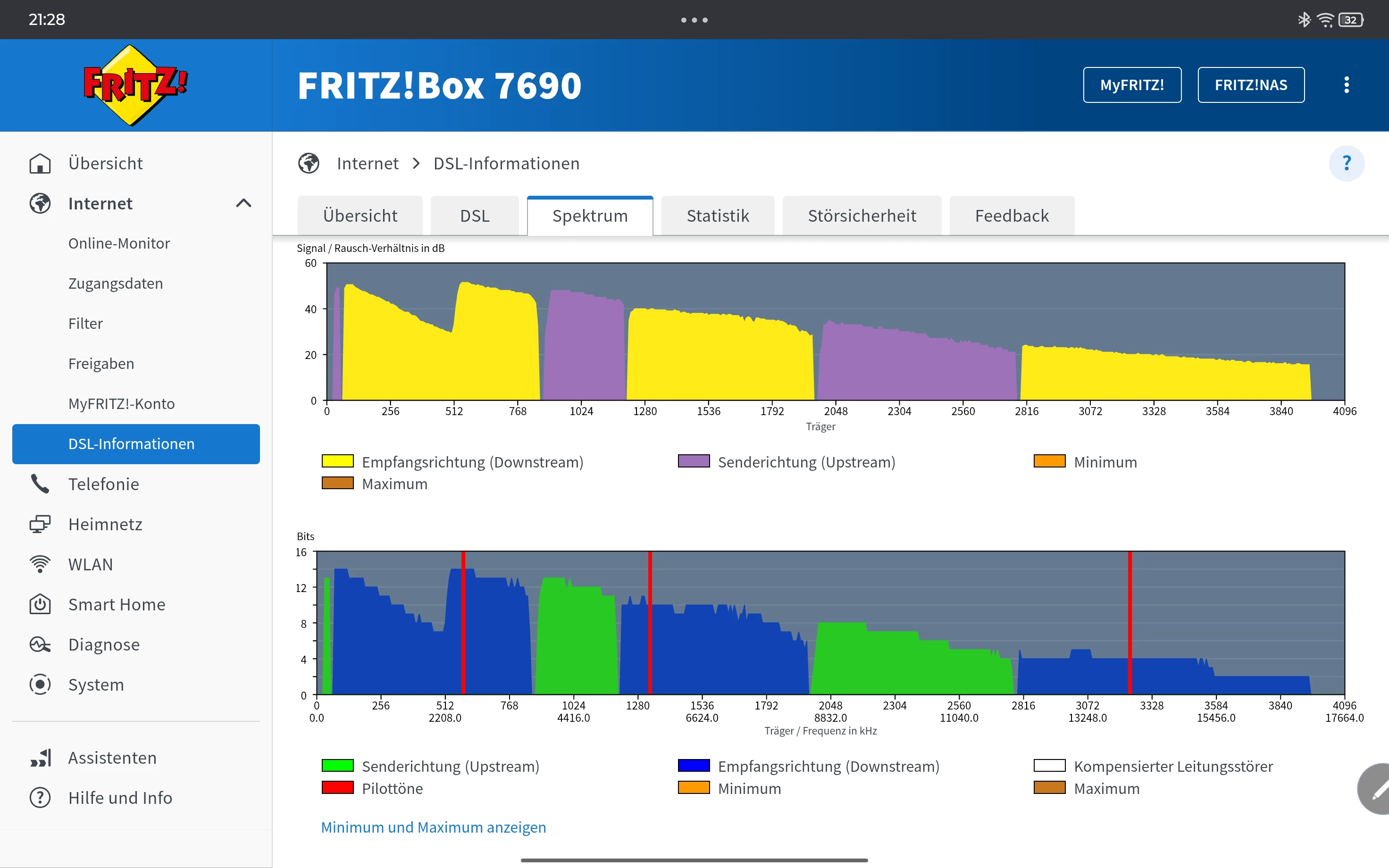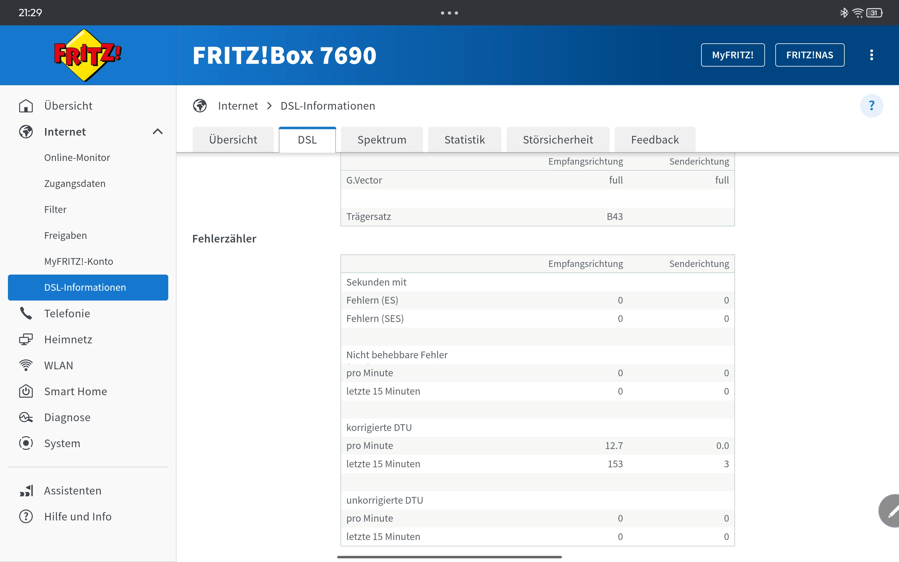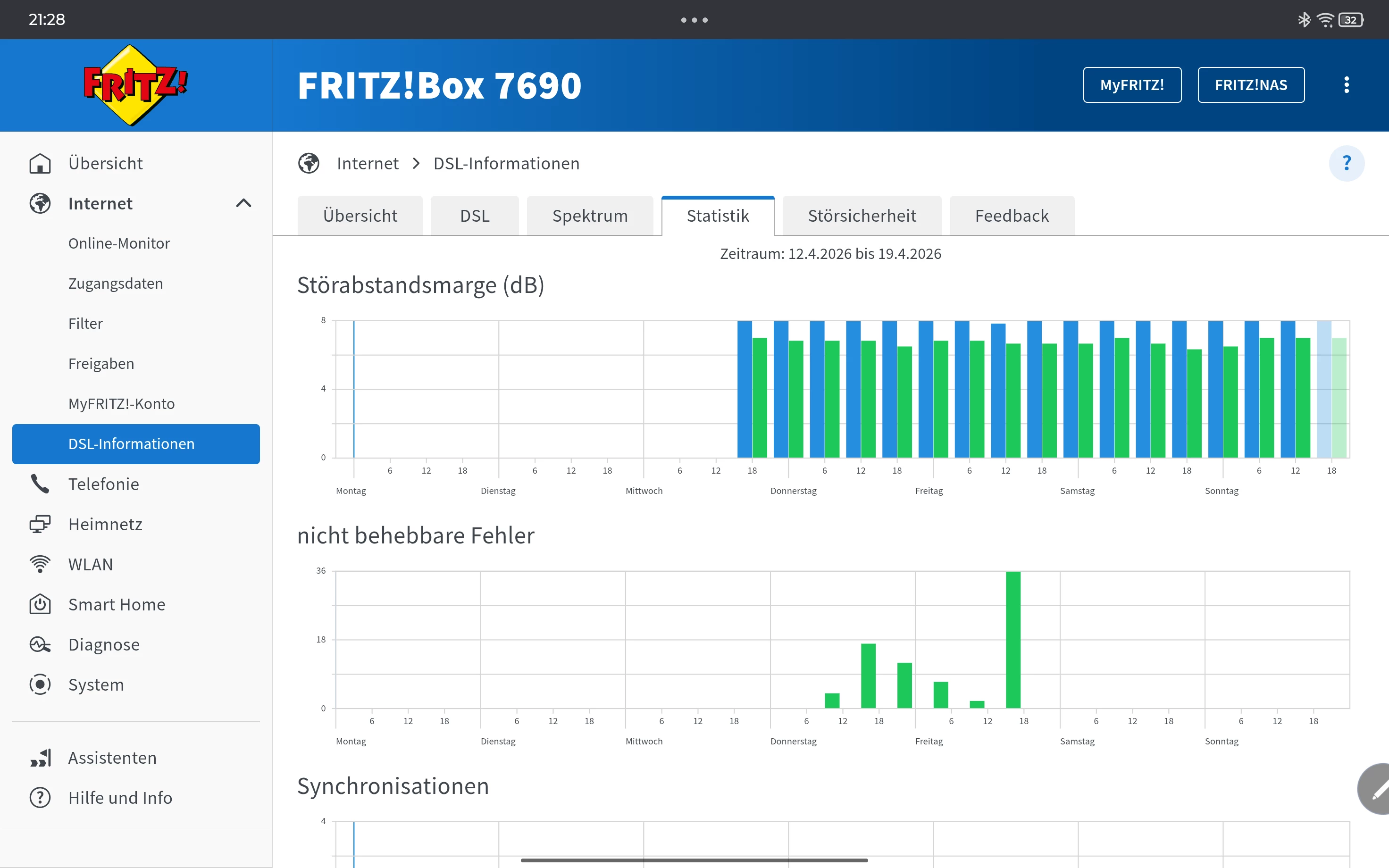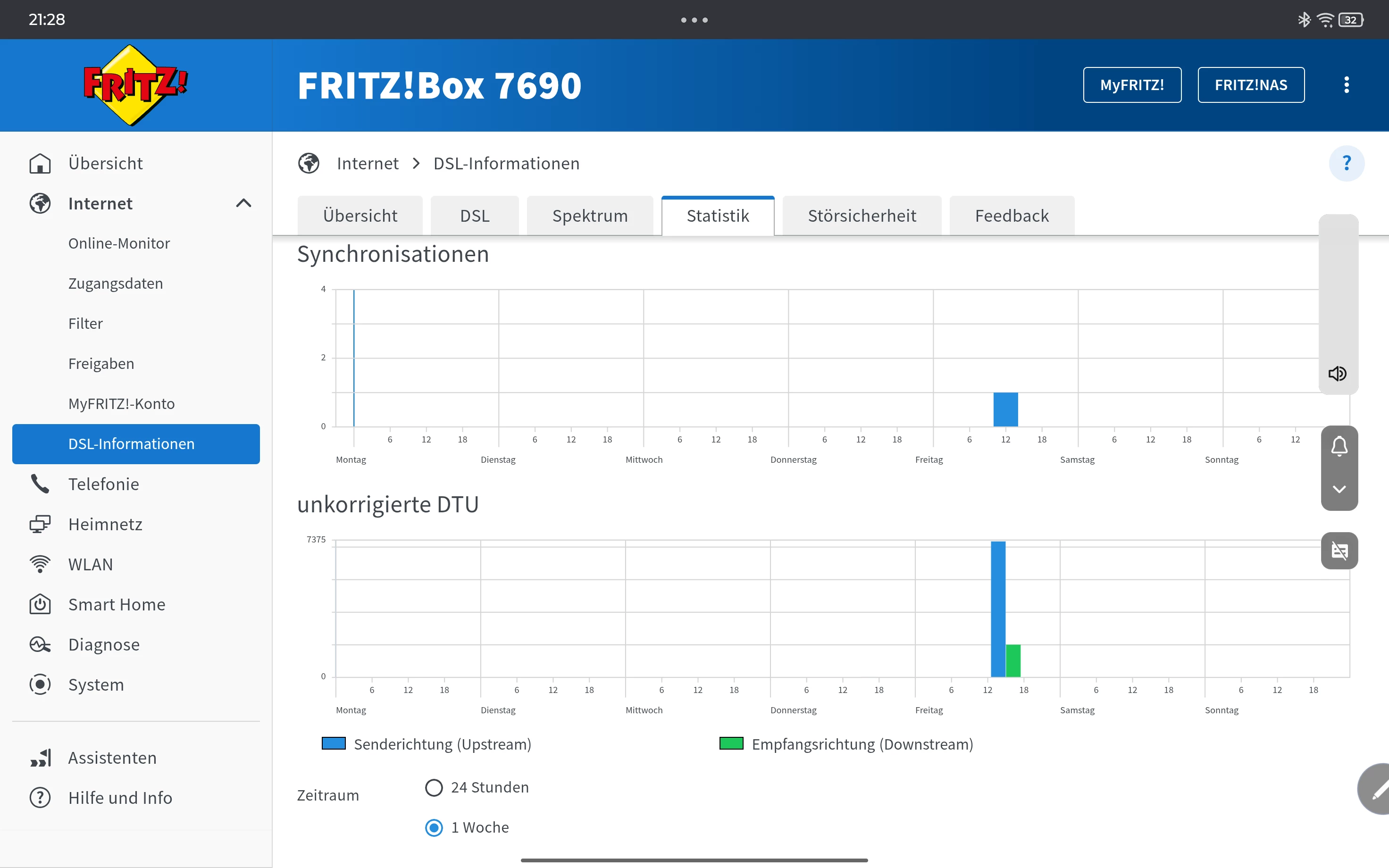 Internet/DSL Informationen/ Tab DSL (inkl. DTU Fehler). Spektrum und Statistik (1 Woche)