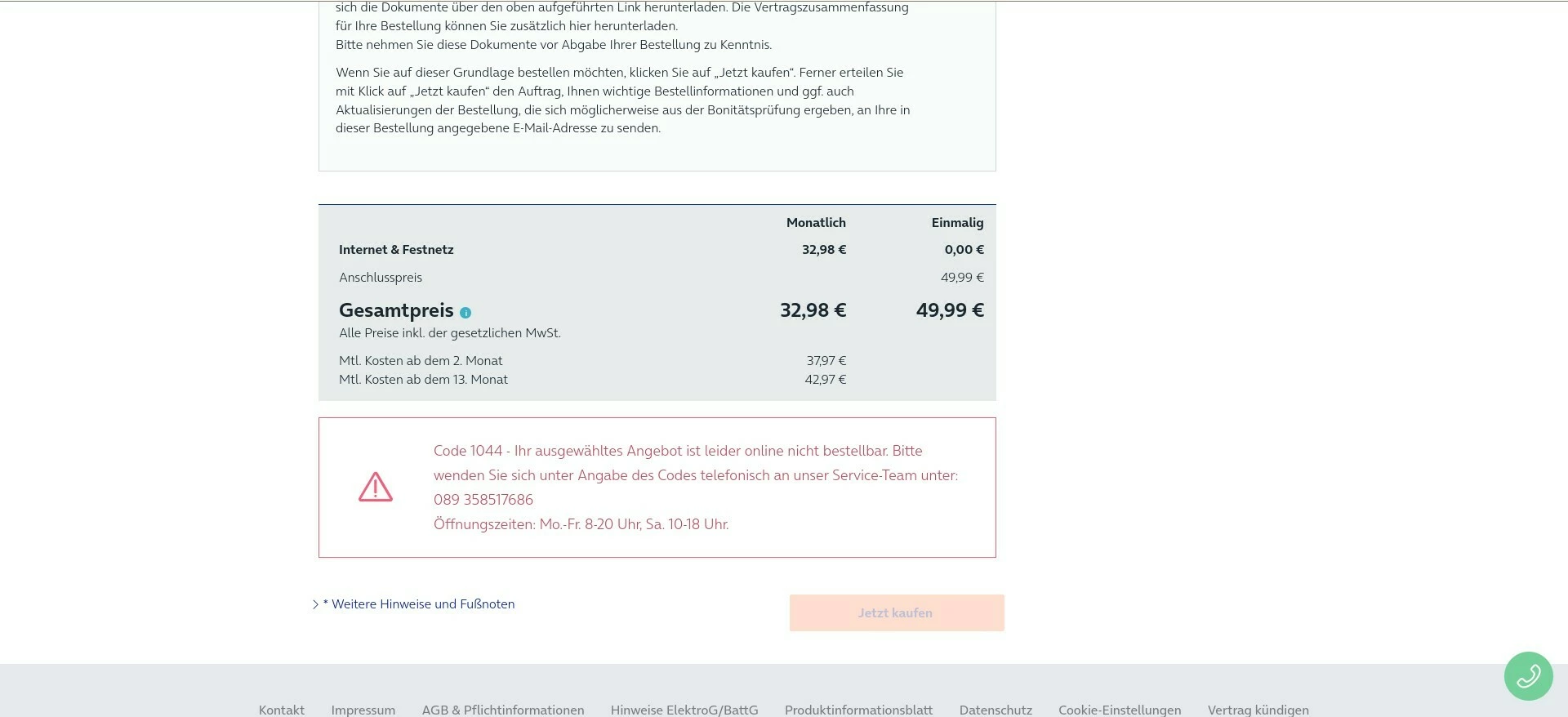 Code 1044 - Ihr ausgewähltes Angebot ist leider online nicht bestellbar. Bitte wenden Sie sich unter Angabe des Codes telefonisch an unser Service-Team unter: 089 358517686