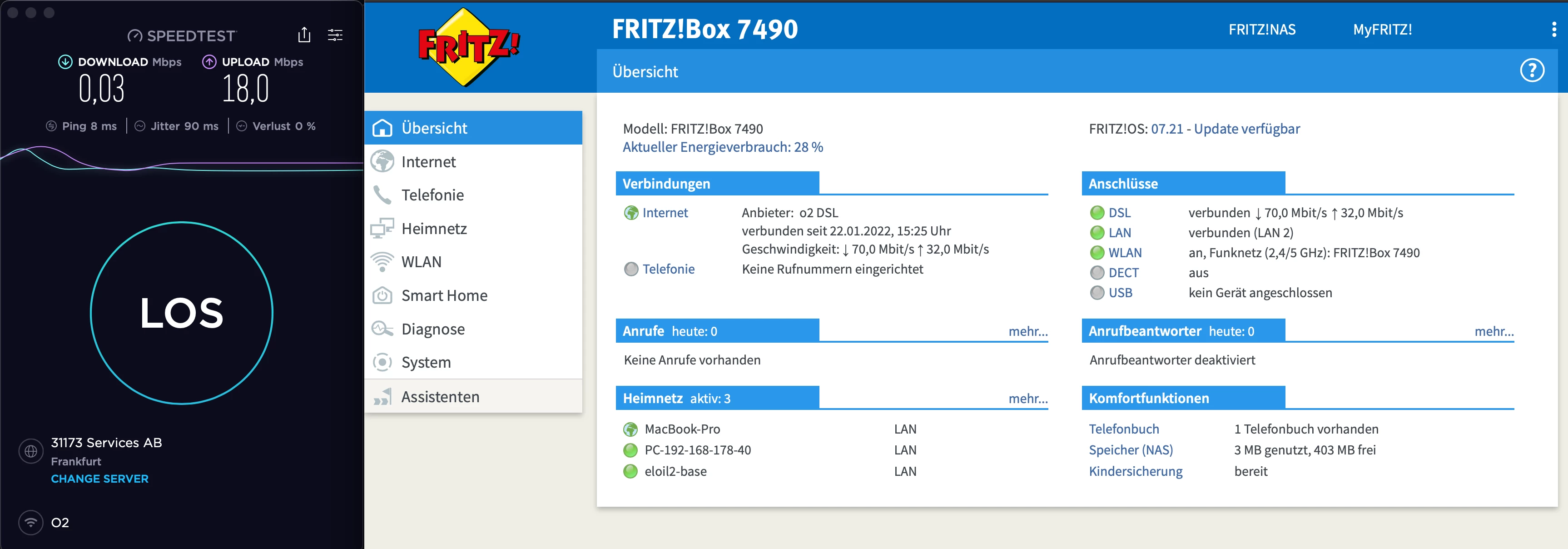 … Nachtrag: Ich habe ein MacBook eben mit einem LAN Kabel mit der fritz!box verbunden, auch hier ist beim Spendetest der Durchsatz bei max. 1.5Mbit/s