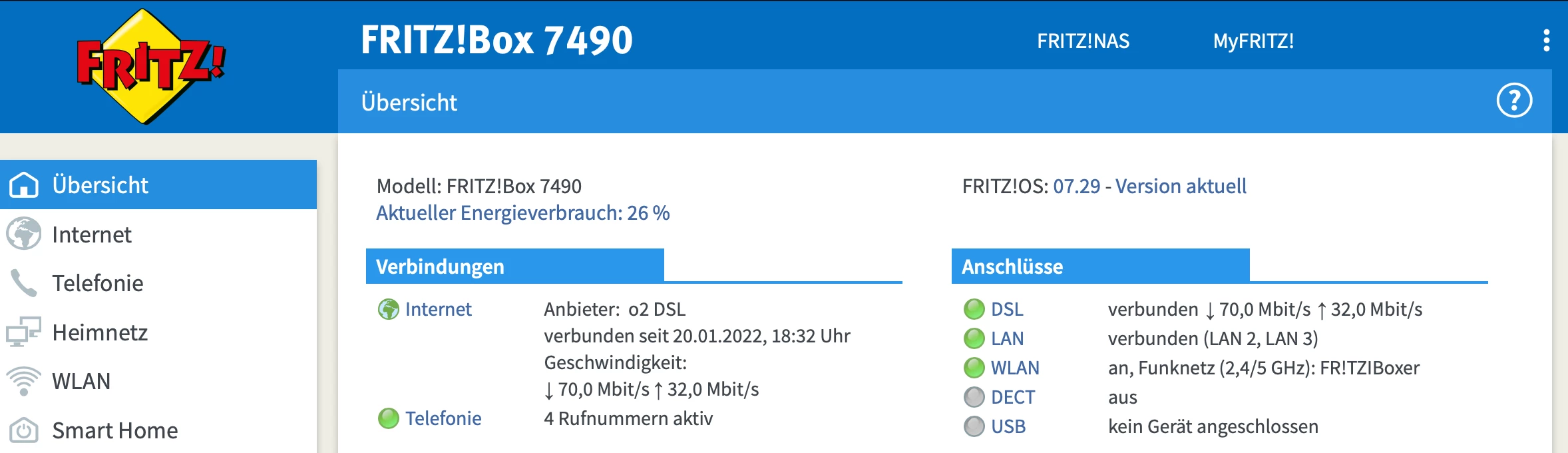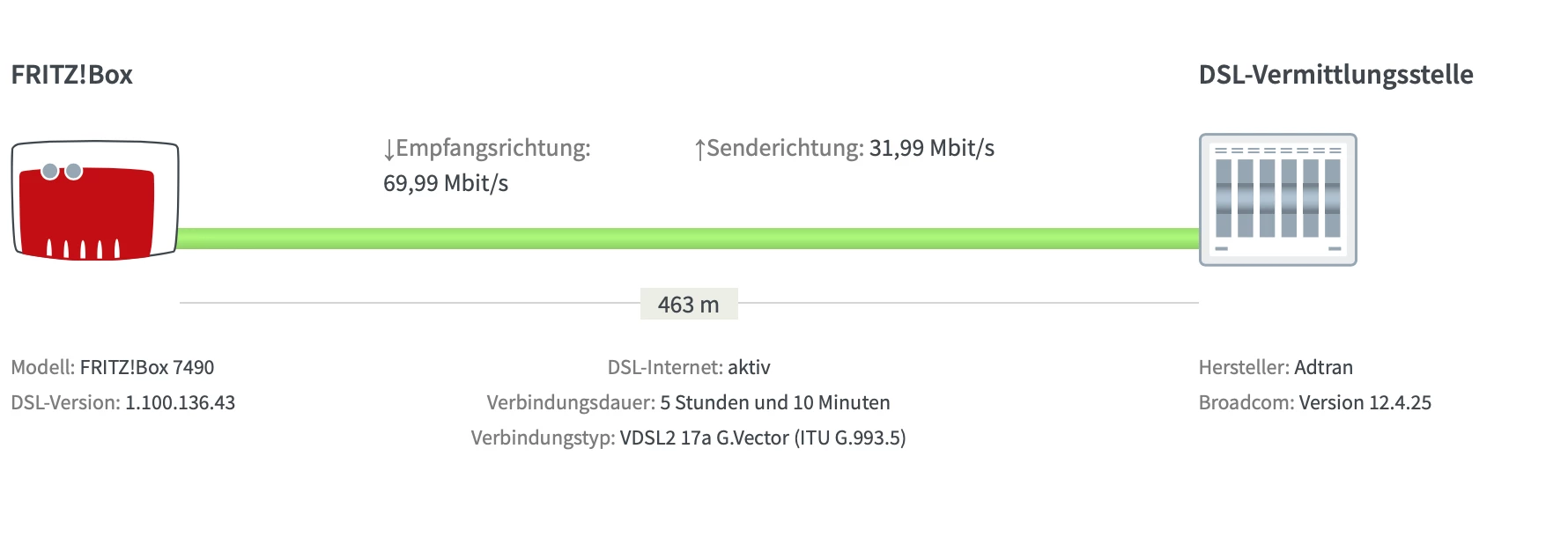 • Laut Fritz!Box steh aber die Verbindung mit 69,99 Mbit/s Up und 31,99Mbit/s Downstream.