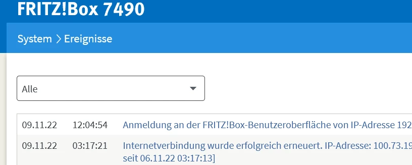 Nach einem Ausfall bitte direkt unter den Ereignissen in der Fritzbox schauen und die aktuellen Meldungen hier reinkopieren. Sieht dann so aus: (Am besten nicht “Alle”, sondern gefiltert auf Internetverbindung)