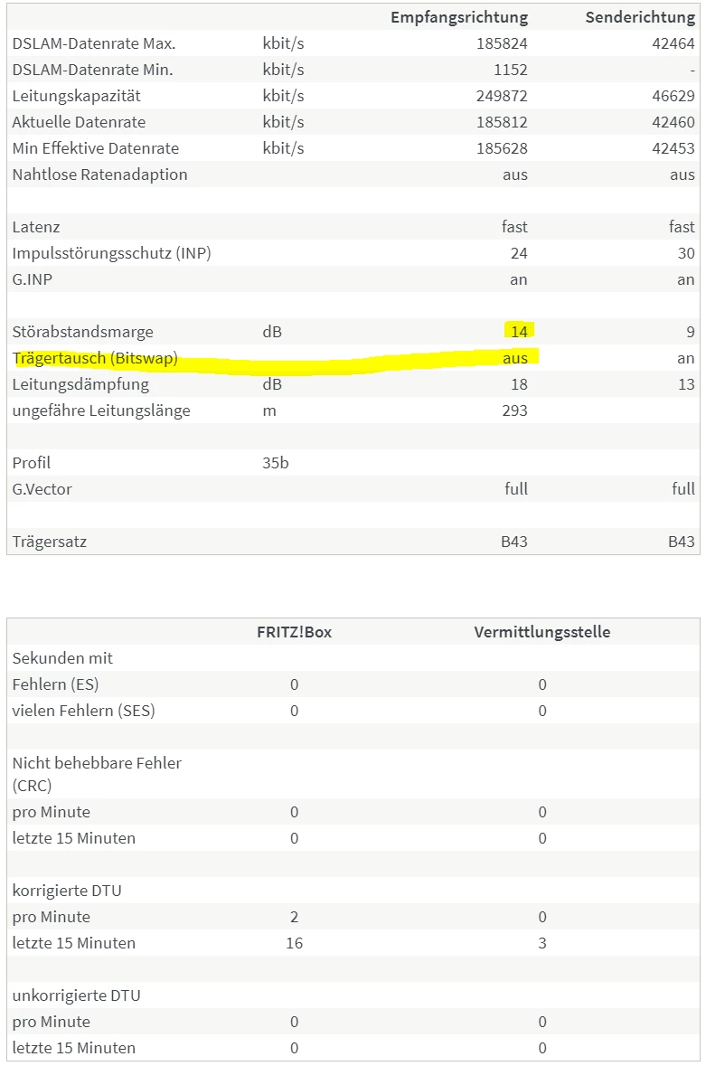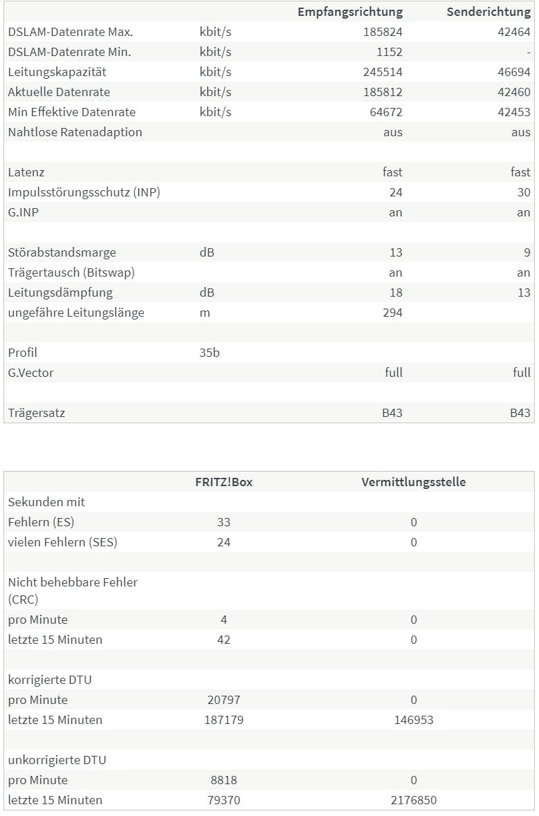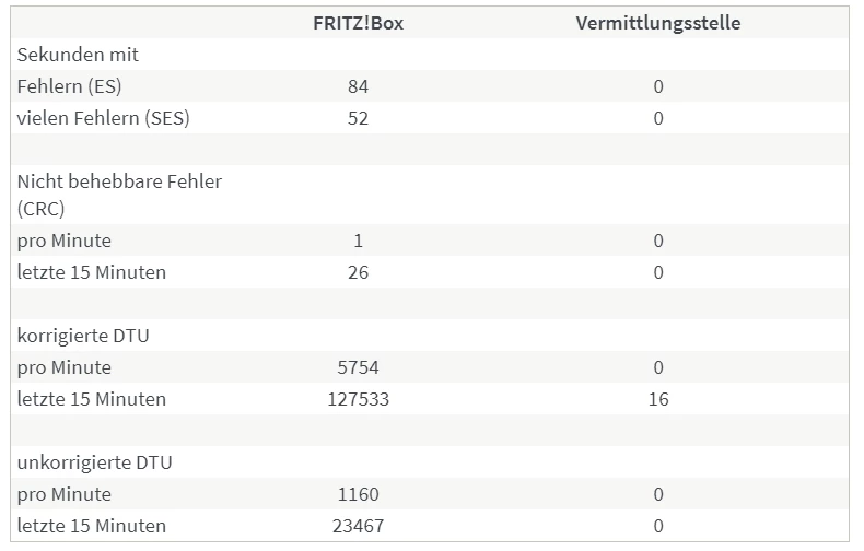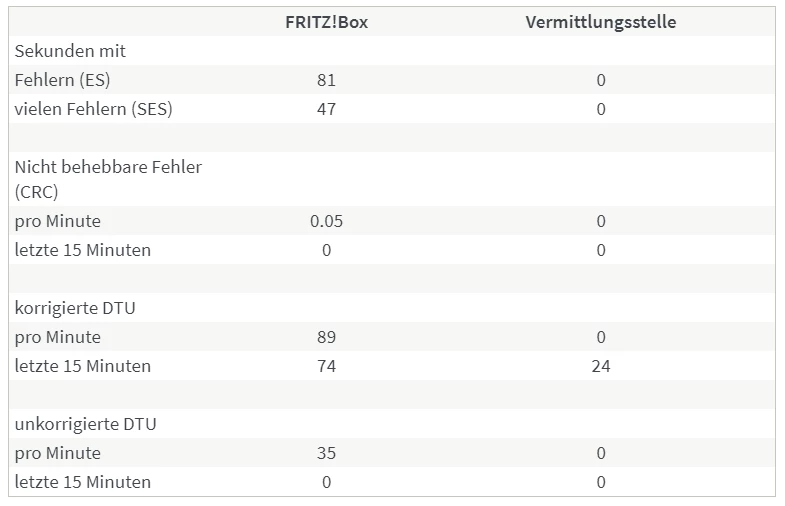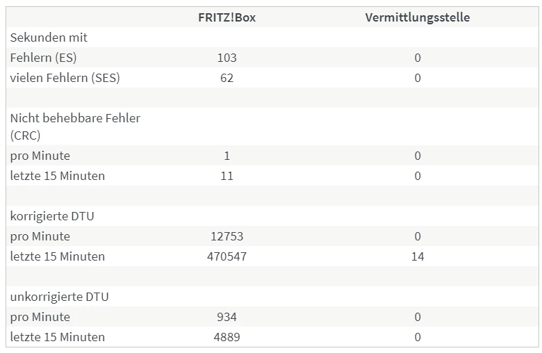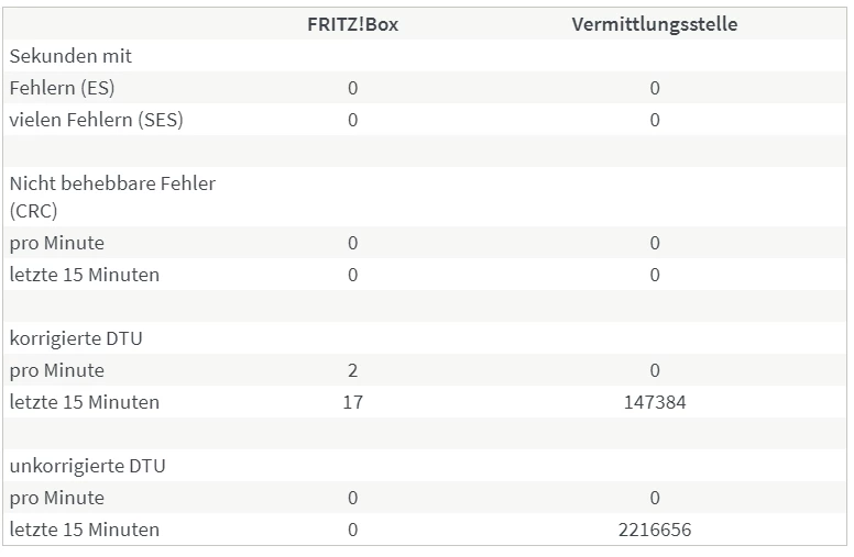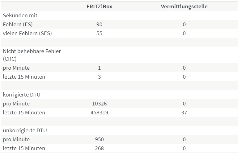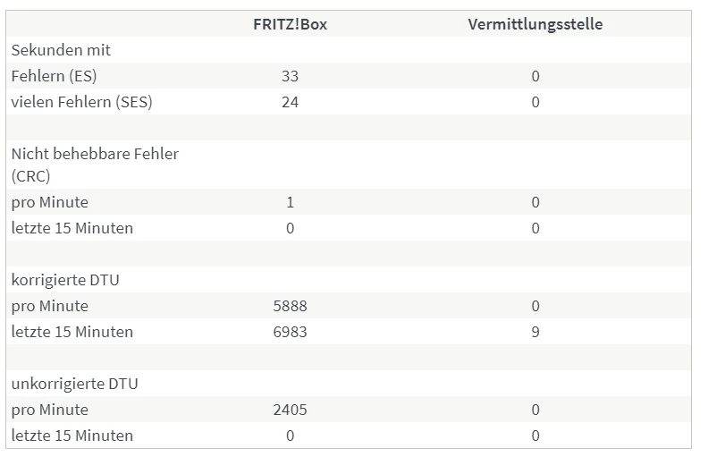 Wie genau kamst du zu der Annahme, die “Fehler lägen nicht auf Seiten der Leitung”? Weil die Fehler in der Spalte FRITZ!Box stehen? Besteht denn da ein Kausalzusammenhang, und wie sähe das Fehlerbild aus wenn es an der Leitung oder etwas anderem als der Fritzbox selbst läge?