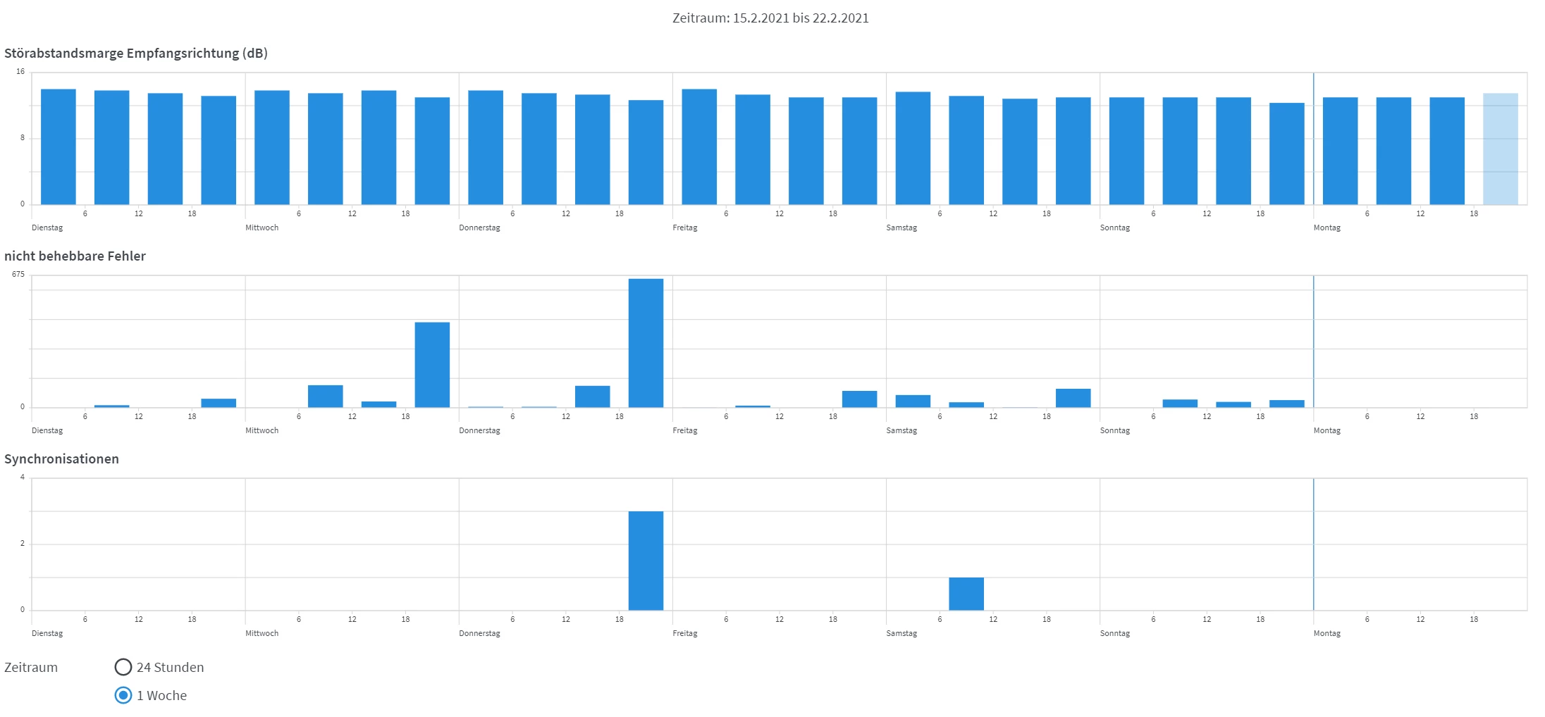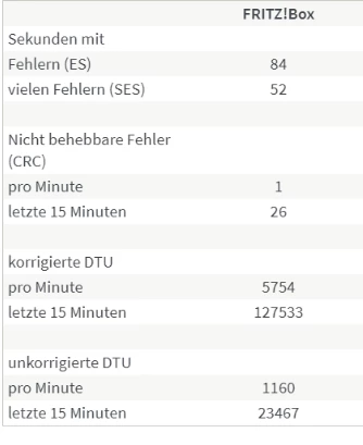 P.S.: Mir schien so, als wenn es in der vorherigen Woche vom 15.02. - 19.02 Störungen der lokalen Netzinfrastruktur gab (meist zwischen 18:00 und 20:00 Uhr). Der Fehlerzähle zeigte kurzzeitig 2 Millionen “​korrigierte DTU” und Tausende “unkorrigierte DTU” an, und es kam zu ein paar Verbindungsabbrüchen. Die Fritzbox konnte sich dann aber sofort wieder neu Synchronisieren.