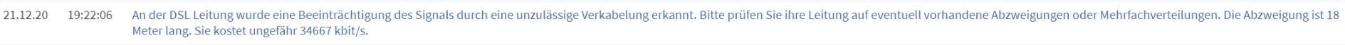 Es gab bis Ende Dezember 2020 eine “illegale Verkabelung” (Meldung im Protokoll der Fritzbox). Es war tatsächliche eine Abzweigung zu einer weiteren TAE parallel angeklemmt.