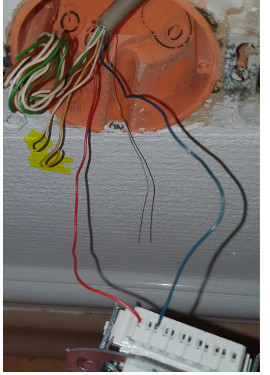 Die Beiden mit gelben Hintergrund markierten Kabel (weiß und gelb) waren bis Ende Dezember 2020 parallel auf das rote und blaue Kabel der TAE-Dose geklemmt. Nachdem ich diese abgeklemmt habe meldete die Fritzbox auch keine “unzulässige Verkabelung” mehr. Im Schlafzimmer (Foto im vorherigen Post) waren wiederum auch rot und blau an der von mir entfernten LSA-TAE-Dose angeschlossen. Scheint also so zu sein, dass das weiße und gelbe Kabel des Wohnzimmers irgendwo - (eventuell unten im Keller am APL) mit dem roten und blauen des Schlafzimmers verbunden waren.
