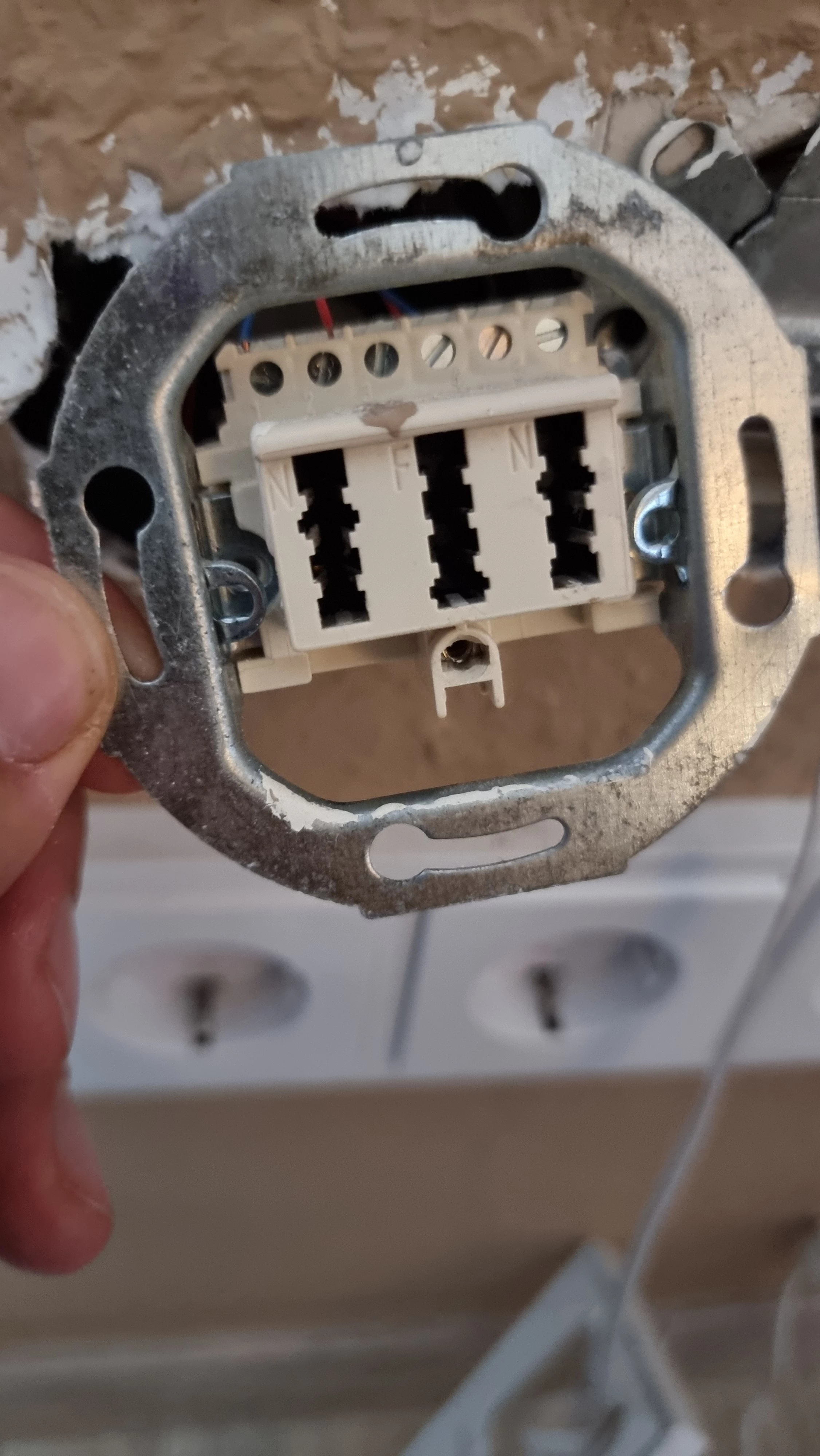 Dann sehe ich nur ein Kabel abgehend zu der einen TAE-Dose (rot/schwarzes Adernpaar). Anscheinend muss noch wo anders eine weitere Abzweigung auf der Strecke APL-/TAE-Dose sein, sonst hätte die zweite TAE-Dose mit blau/rotem Adernpaar kein Signal.