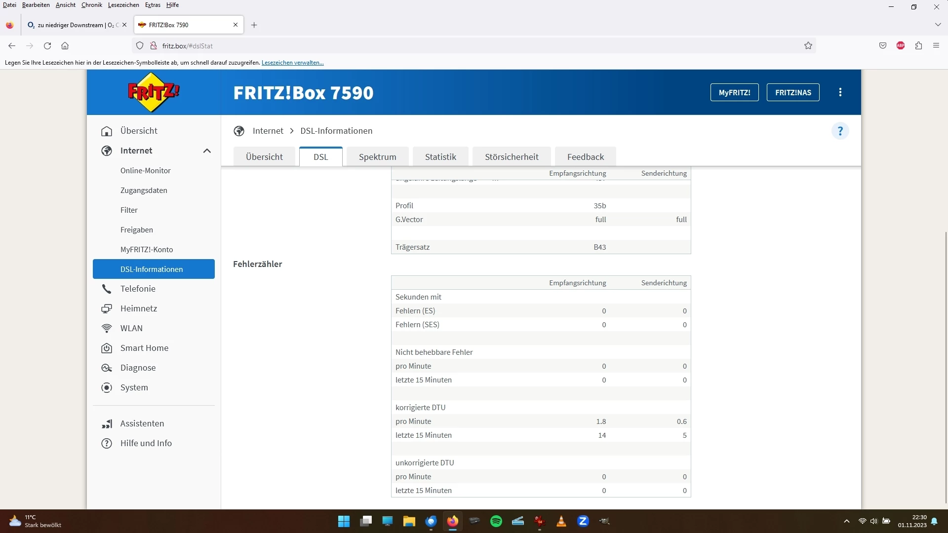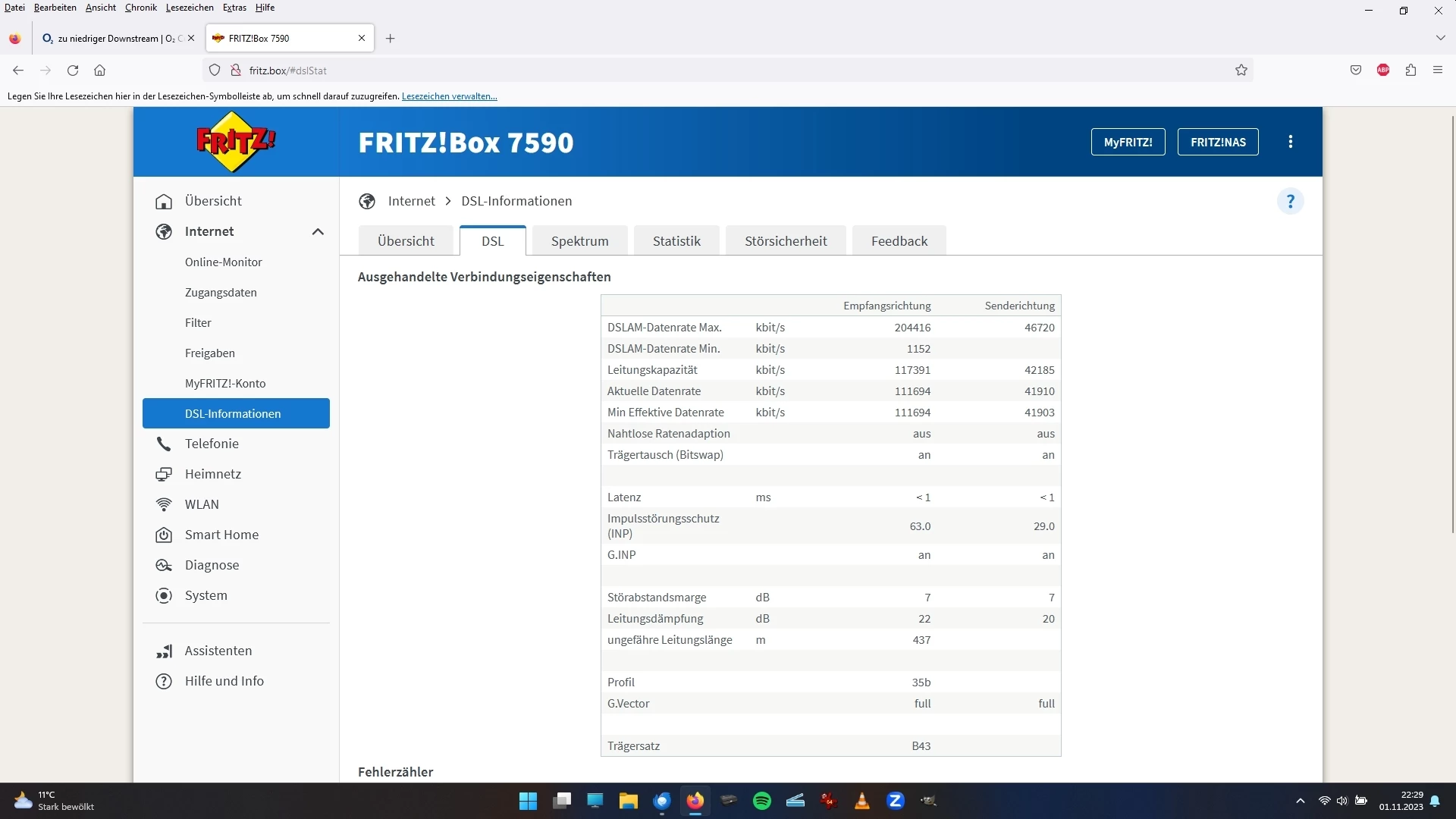 Bin jetzt ohne Fehlermeldung bei 112 Mbit Downstream und 41 Upstream. Das ist in etwas das, was die Fritzbox berechnet hat, durch die fehlerhafte Schaltung.