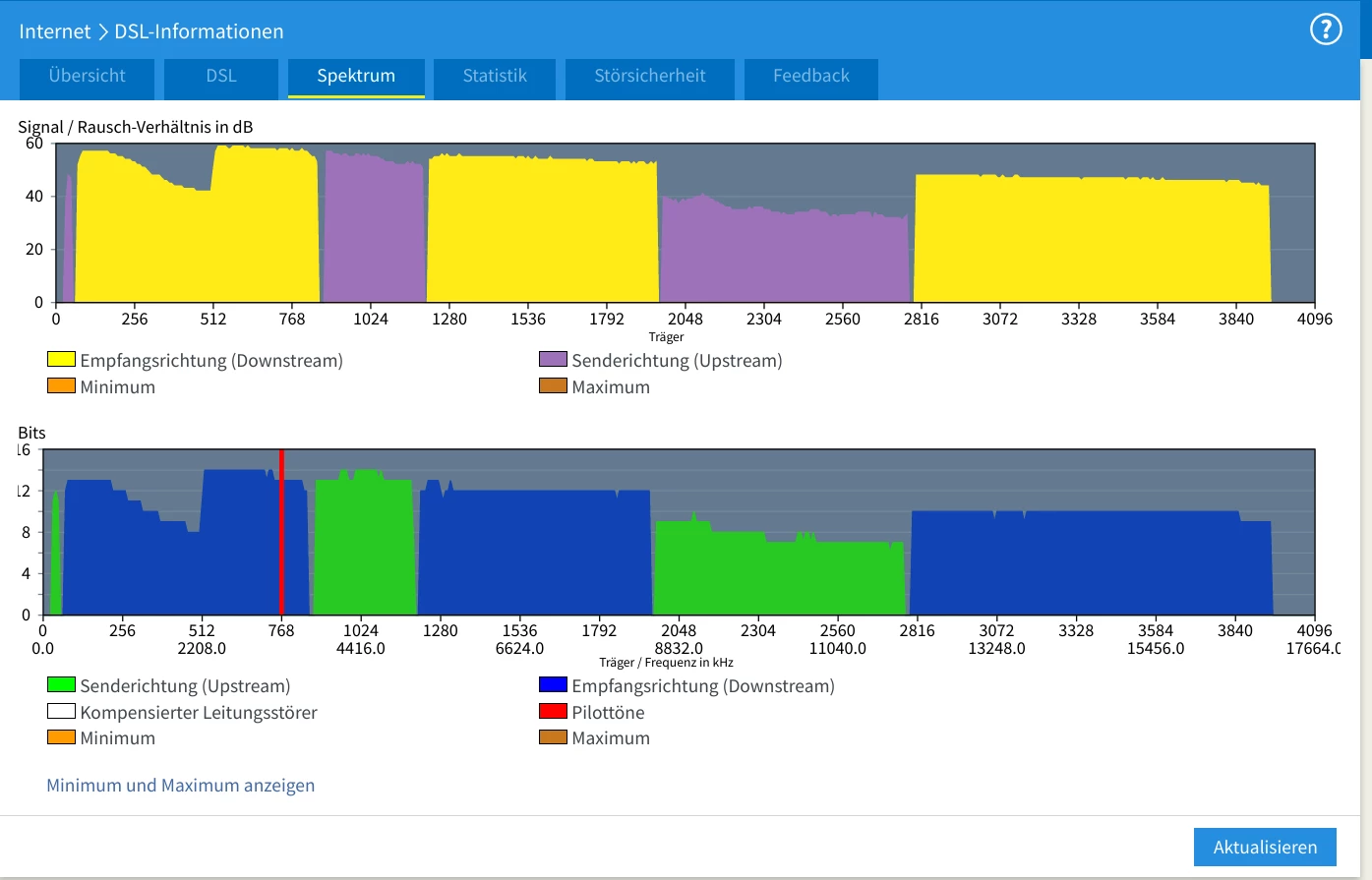 Könntest Du bitte, wenn noch nicht geschehen, im Hauptmenü der Fritzbox unten links „Ansicht erweitert“ aktivieren und dann unter Internet/DSL Informationen/Störsicherheit testweise den vorherigen DSL Treiber aktivieren.