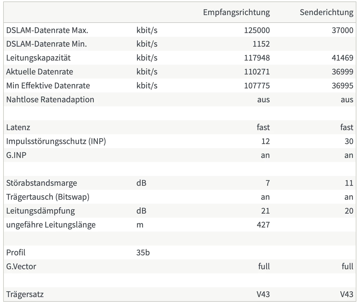 Die Bandbreite ist immer noch höher wie mit dem reinen DSL-Modem: ↓ 110,3 Mbit/s↑ 37,0 Mbit/s