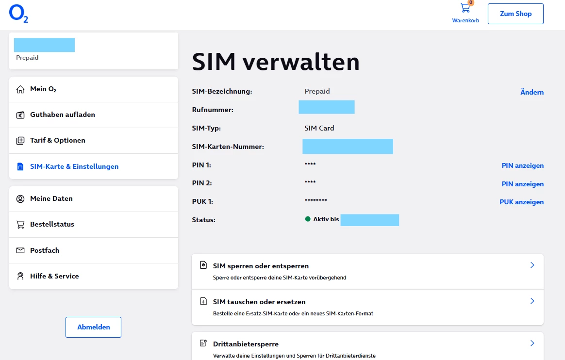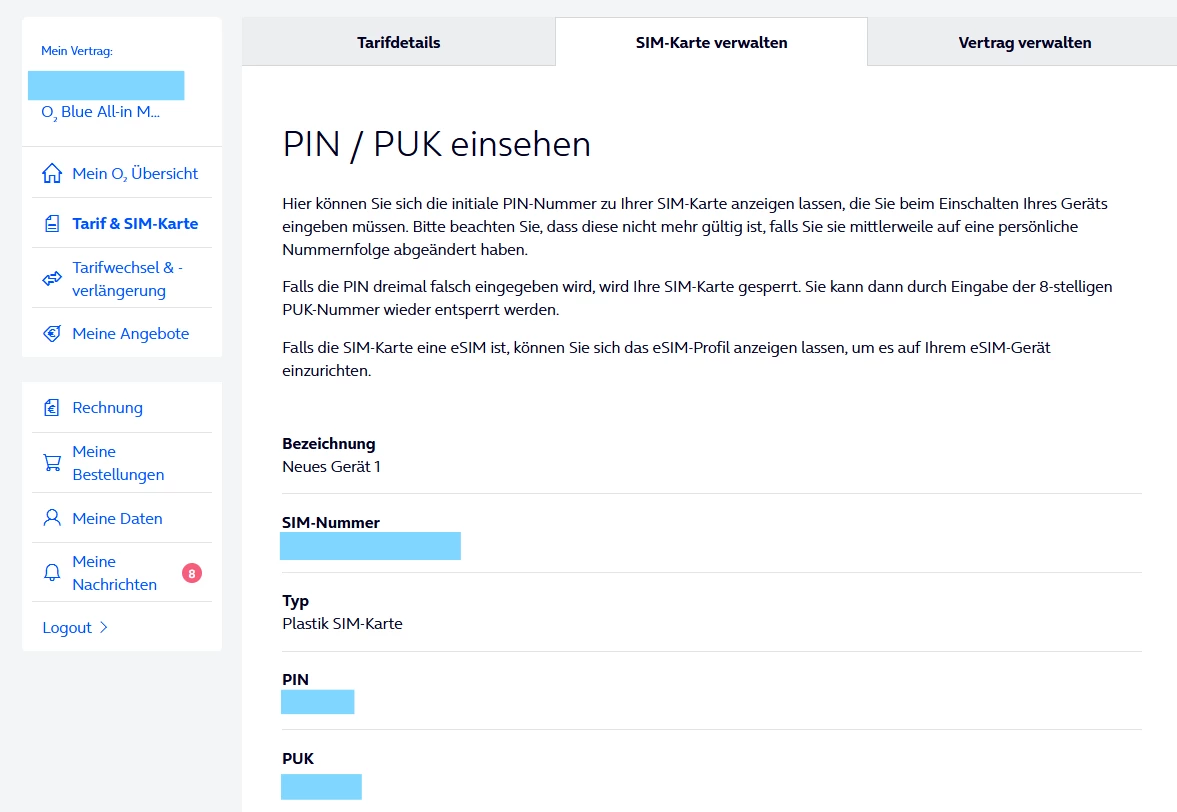 You can view your PIN and PUK by logging in to our online portal. From the menu on the left select “Mein o2” > “Tarif & SIM-Karte” > “SIM-Karte verwalten” > "PIN & PUK einsehen". Or follow the direct links: