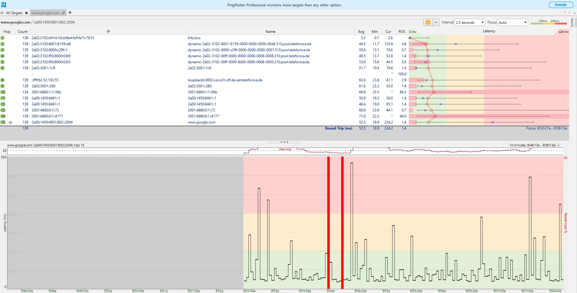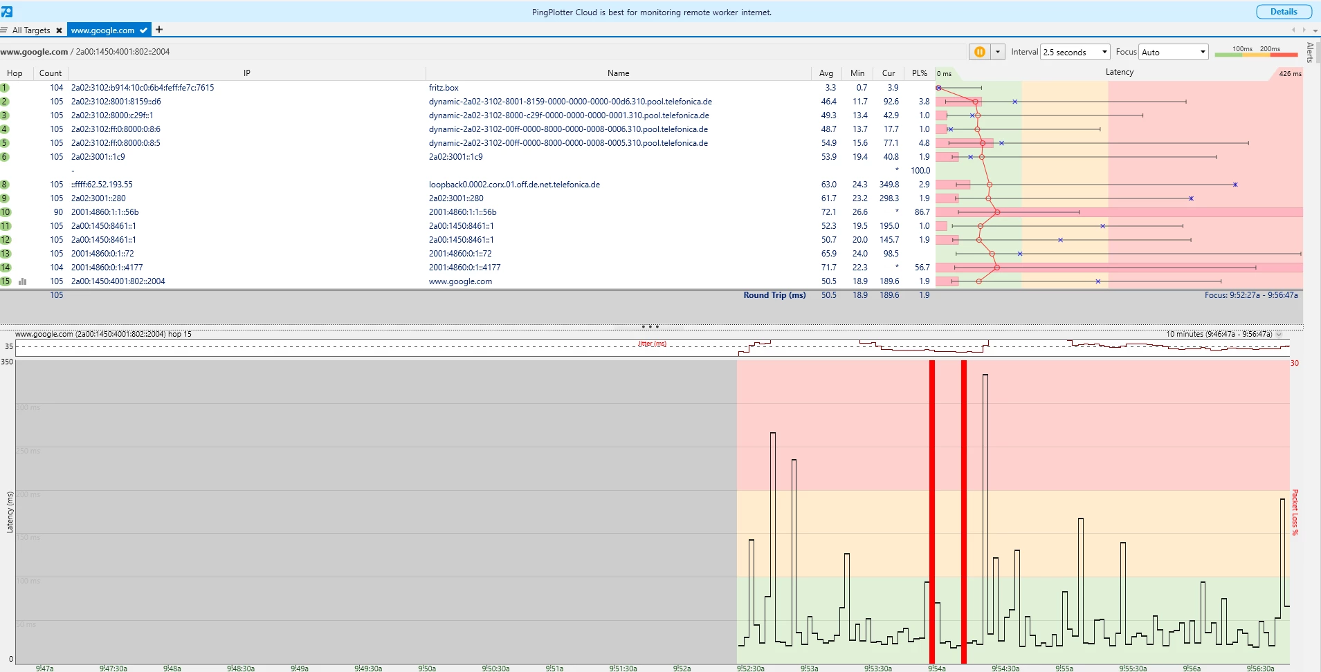 • Hops through telefonica.de show persistent spikes, reaching over 200ms at some points.