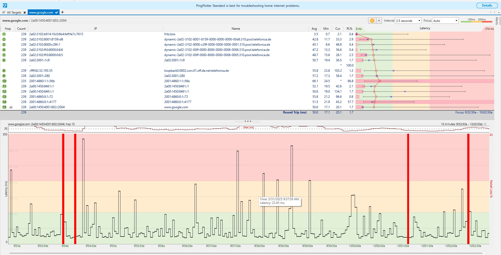 • Final hop (Google): 1.7% packet loss, which can already affect connection quality.