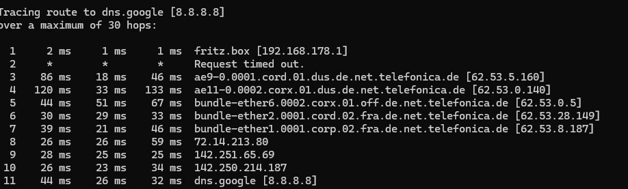 I've performed tests including ping and traceroute to 8.8.8.8, and the results indicate the issue begins within your network infrastructure and continues along the route — especially through telefonica.de nodes.