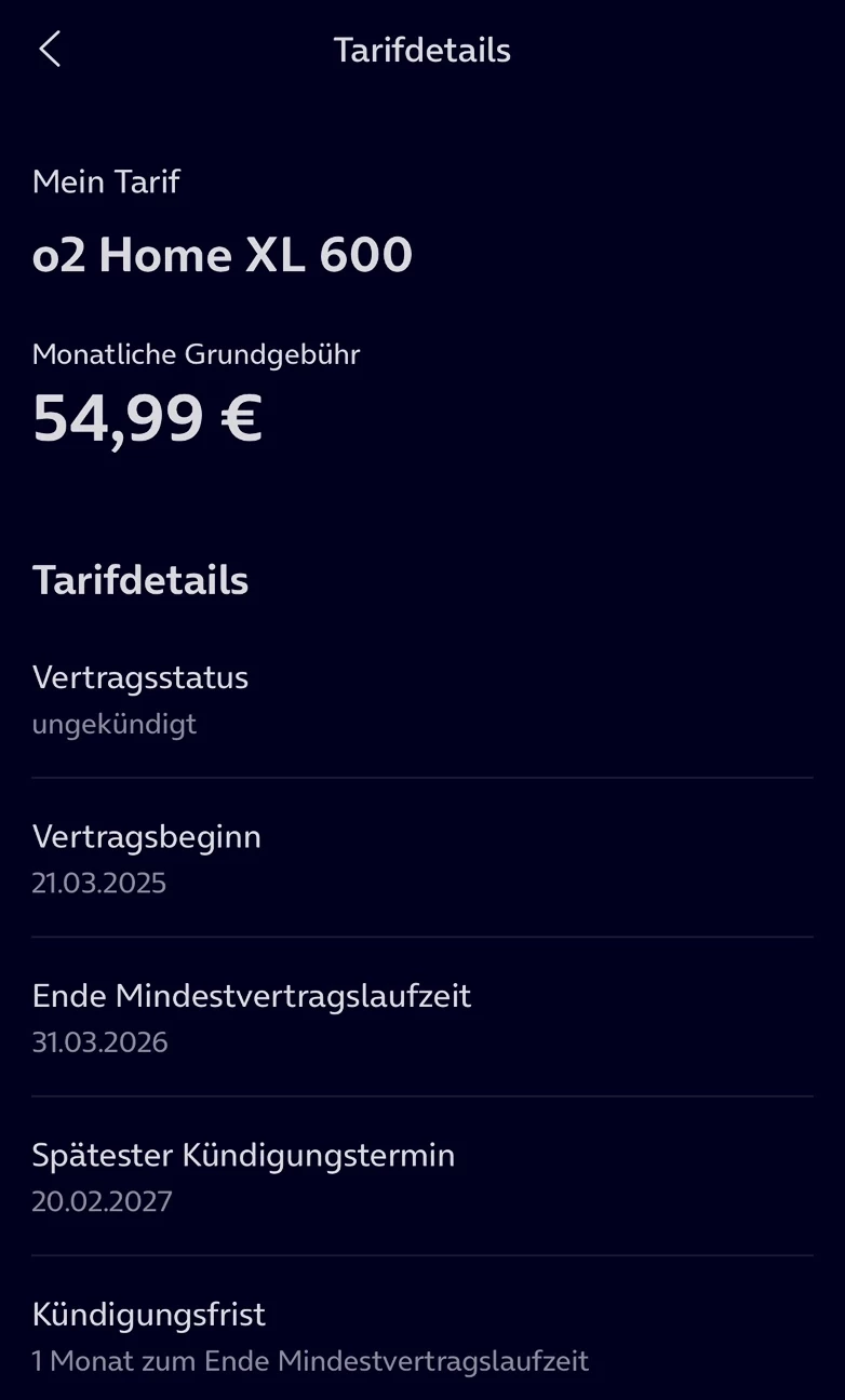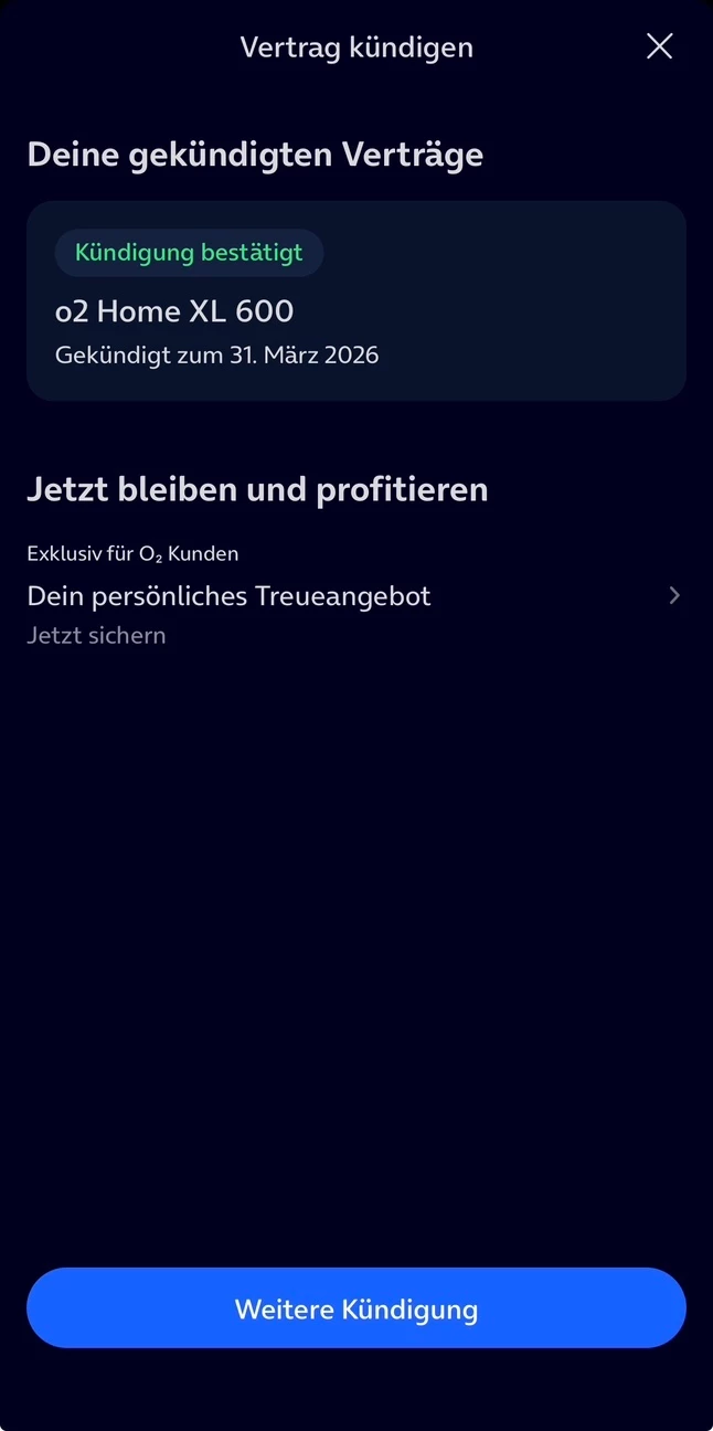 • O2 Activation Team stated, that in this case the contract has to be cancelled (Sonderkündigung), because the same level of service is not possible.