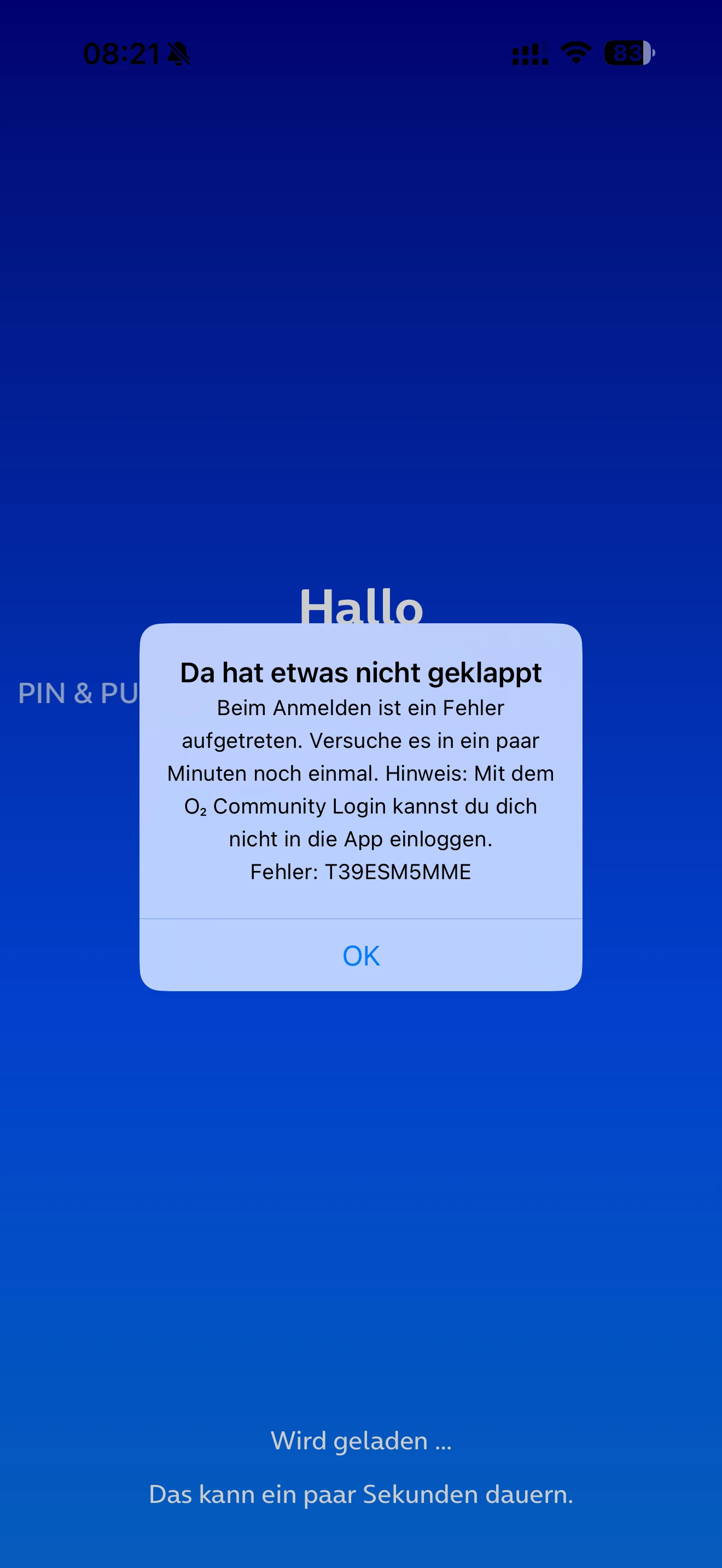 I have an issue with meine O2 App. I am no more able to login and getting a pop up error message.