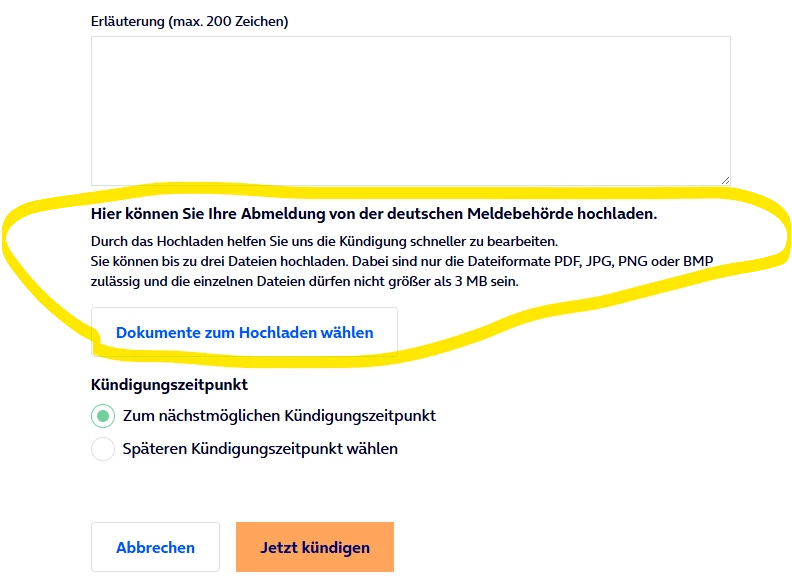 Finally you can upload your deregistration of your place of stay in Germany and a proof that you are now registered, working or studying in a different country than Germany: