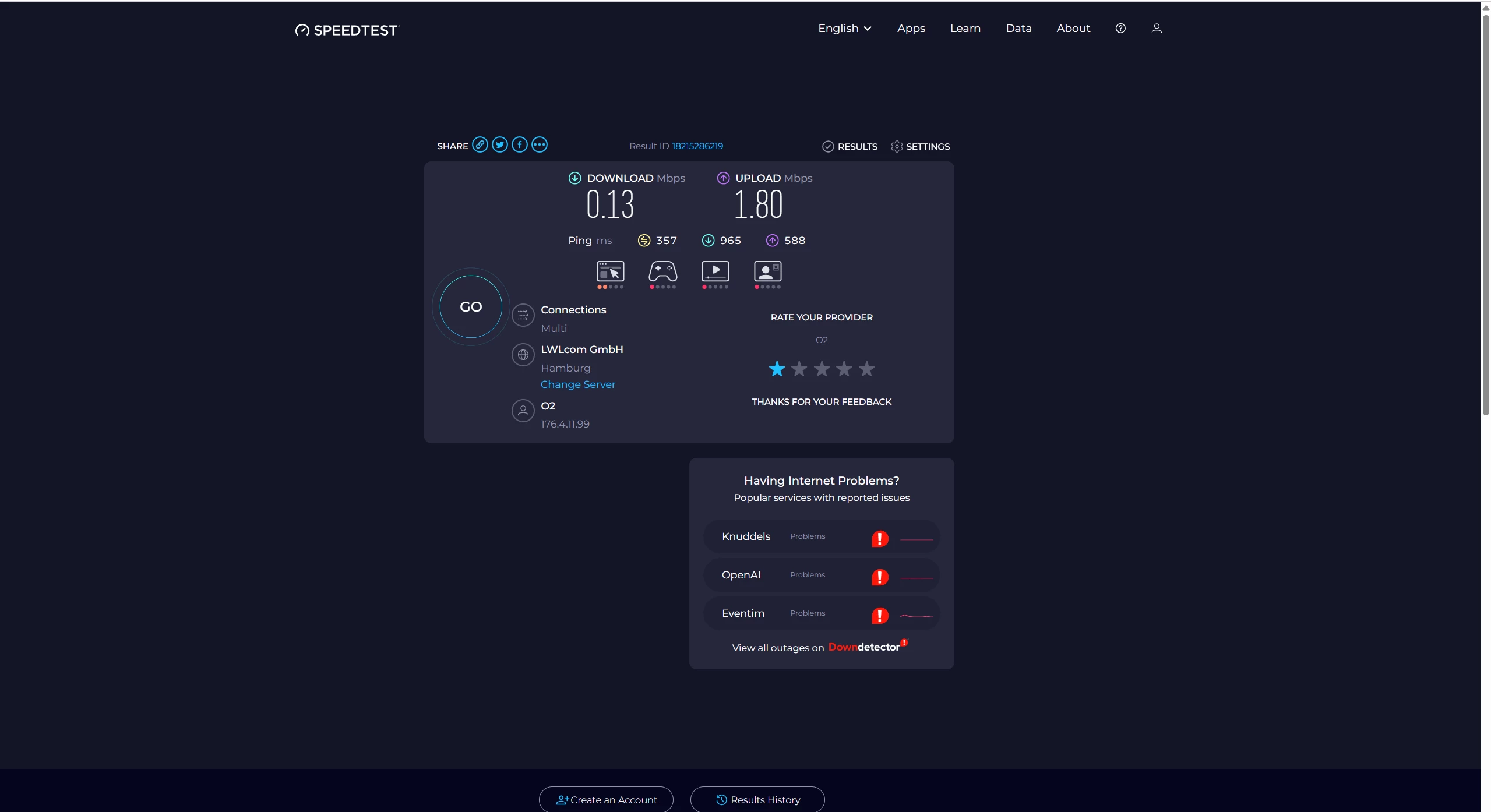 A throughput of 2.44Mbps within O2 network itself is a shame. My signal strengths are all good and there has been no change in the settings on my router.  Apparently, there is quite a bit of congestion on your network or WAN links which are being used.