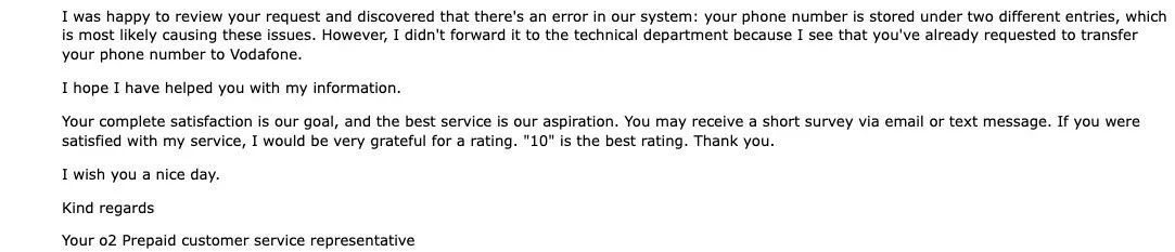 @o2_Rebecca ​@o2_Daniela ​@o2_Gerrit  Finally the O2 agreed they had a system error. However, to my surprise, they decided to not forward this to their engineers to solve but advised me to port out to Vodafone. But, how is this justified that I have to pay for the unused service and get my amount forfeited for the entire year’s fee that I have paid you. Do you think this is an ethical practice. I had to port out because, no one had solved my outgoing and internet issue from last 2 months. Even now, I am facing issues with porting out. Because, if they don’t solve this, the balance that is required to port out….won’t let me port out. Can you please make someone understand this issue.