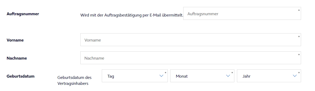 You only need your order number like “WSHW...” for example (“Auftragsnummer”), your name (first and last name, Vorname + Nachname) and the date of birth (Geburtsdatum).
