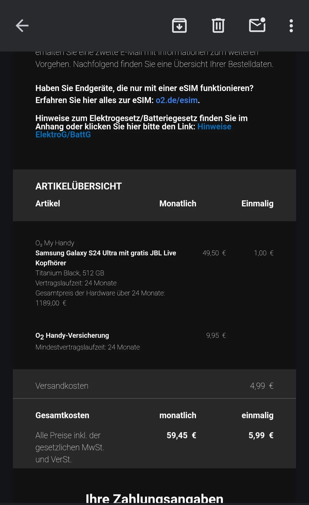 In der Bestellbestätigung vom 22.09 wird das Gerät als „Samsung Galaxy S24 Ultra mit gratis JBL Live Kopfhörer“ aufgeführt.