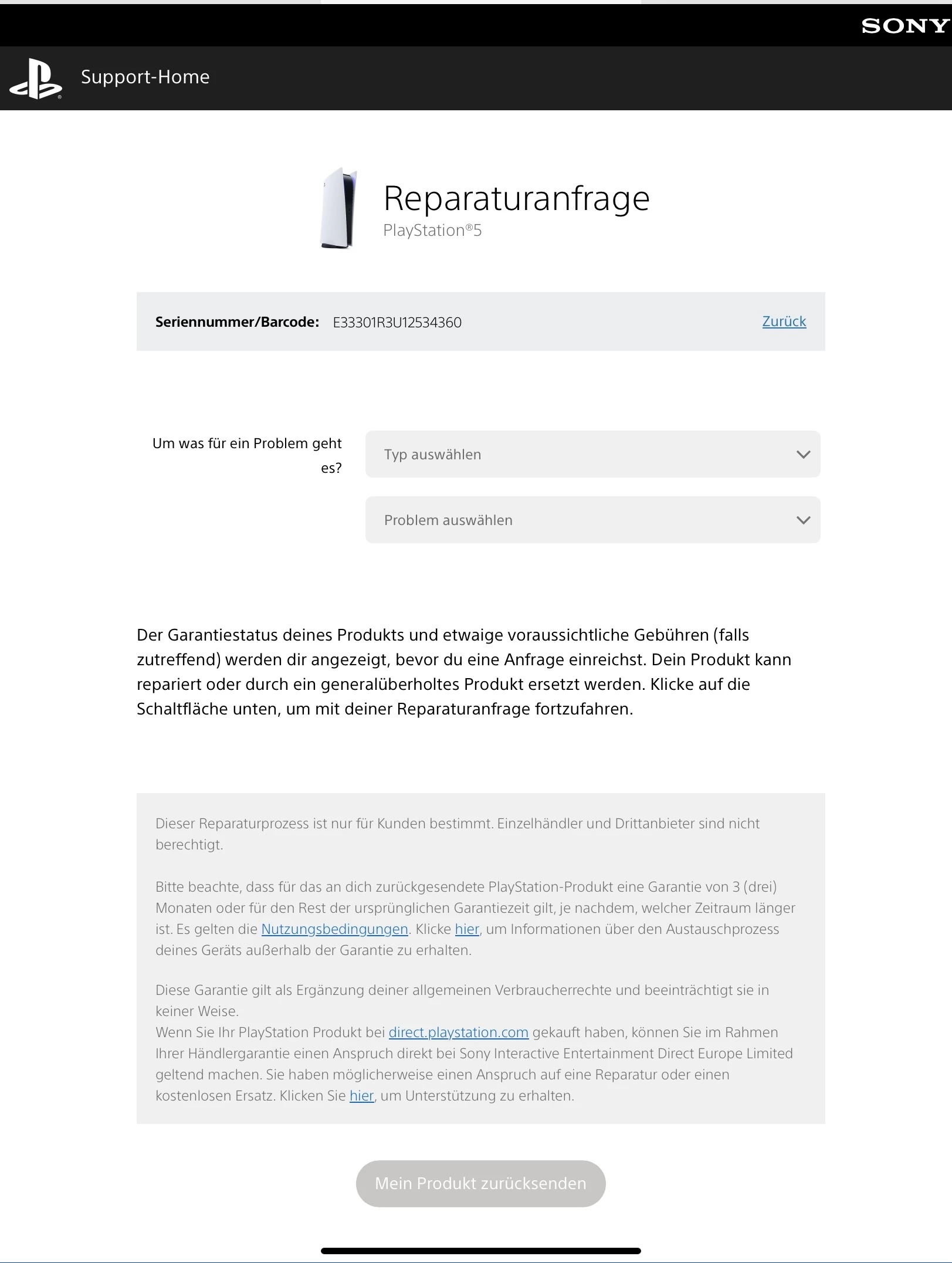 Ich habe auch gesehen, dass bei der Reparaturanfrage eine Seriennummer eingetragen werden muss die mit CFI anfängt. Findest du so eine Seriennummer vielleicht auf deiner Playstation? Bitte probiere das einmal aus und schreib mir nochmal hier.