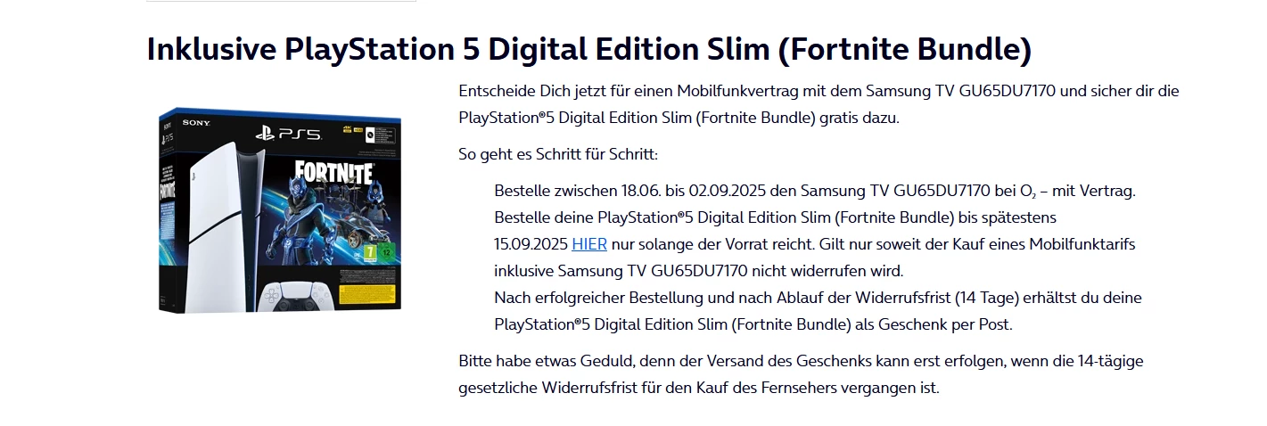 @JW10 Ah ich glaube ich habe die Aktion gefunden. Meinst du diese hier Samsung TV 65" Crystal UHD DU7170 mit PlayStation®5 Digital (Fortnite Bundle)? Dann wird es etwas weiter unten erklärt
