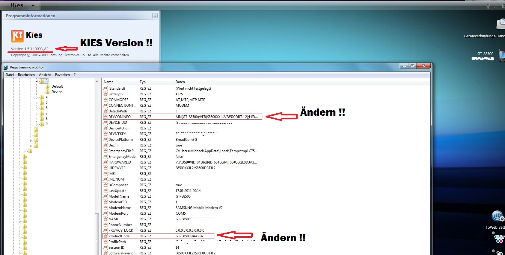 Also, noch einmal : Mit der KIES Version 1.5.3.10093_82 klappt es problemlos. Ich habe ein WAVE von o2, als ProductCode bekomme ich immer : GT-S8500BAAVIA angezeigt, und das ändert man in GT-S8500BAADBT. Und bei DEVICONINFO wird das auch nochmal geändert, und mehr muss da nicht geändert werden !!! Dann klappt es auch ... Du hast wahrscheinlich nur eine neuere KIES Version 😉 Man braucht nix speichern oder sonst irgendwas, nach dem man diese beiden Einträge geändert hat, einfach das Update durchführen...