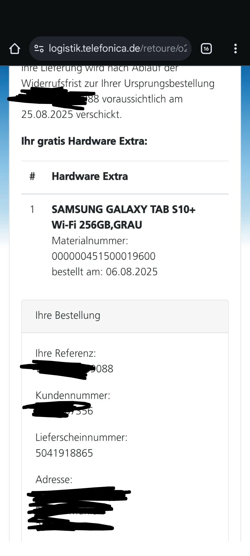 Das Tablet war leider sehr schnell vergriffen, unsere Logistik-Abteilung hatte dich dann am 28.08.2025 per E-Mail angeschrieben, ob du mit der Lieferung eines anderen Tablets einverstanden bist. Alternativ wurde auch eine Rückabwicklung des Kaufvertrags für das Smartphone angeboten.
