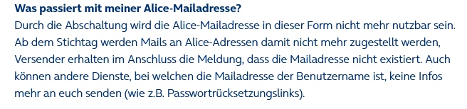Gibt es nicht wenigstens die Möglichkeit /Anregung, dass dann automatische Antwort kommt “alice accounts geschlossen, versuchen Sie es mit xx@o2mail.de”. Würde vielen weiterhelfen nach Abschaltung.