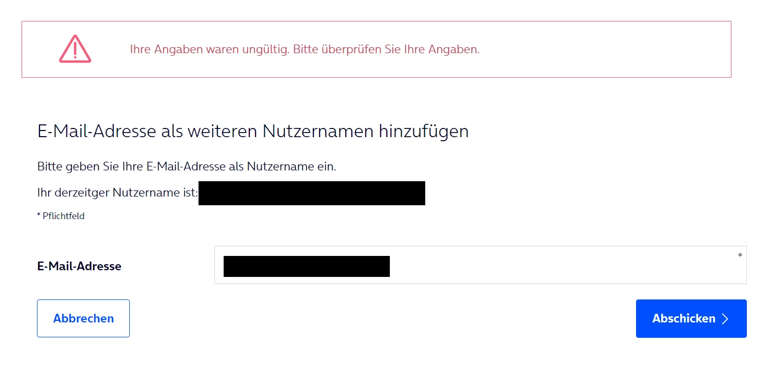 Ich kann die beliebig ändern, wird auch akzeptiert und prozessiert, nur eben nicht mit der besagten “alten” eMail-Adresse, obwohl die als Kontakt-eMail-Adresse problemlos akzeptiert wird und auch funktioniert.