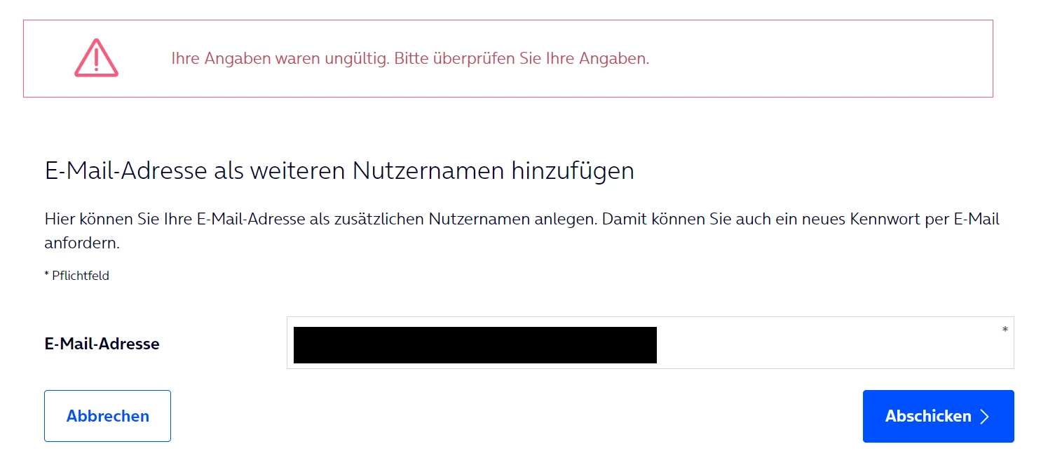 Das Hinzufügen meiner gewünschten eMail-Adresse wird abgelehnt.