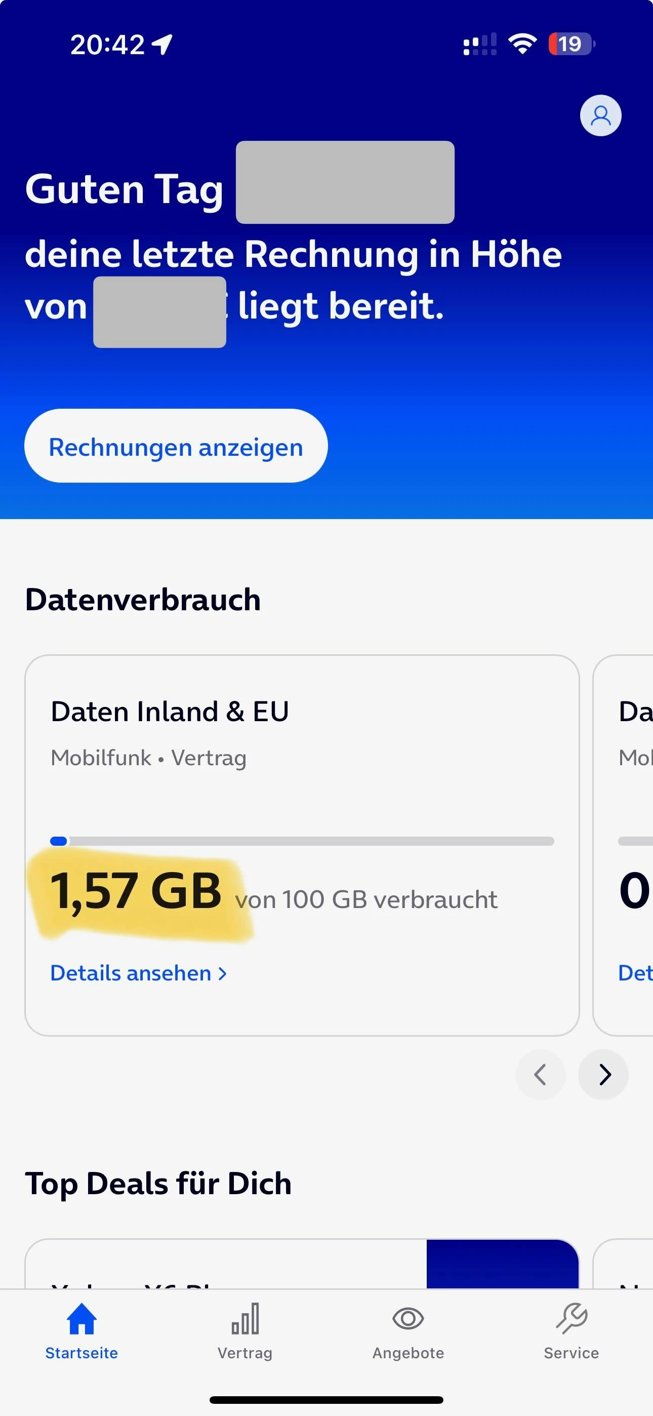 Interessanterweise wird das verbrauchte Datenvolumen auf der Startseite der App um genau 500 MB zu groß angezeigt.