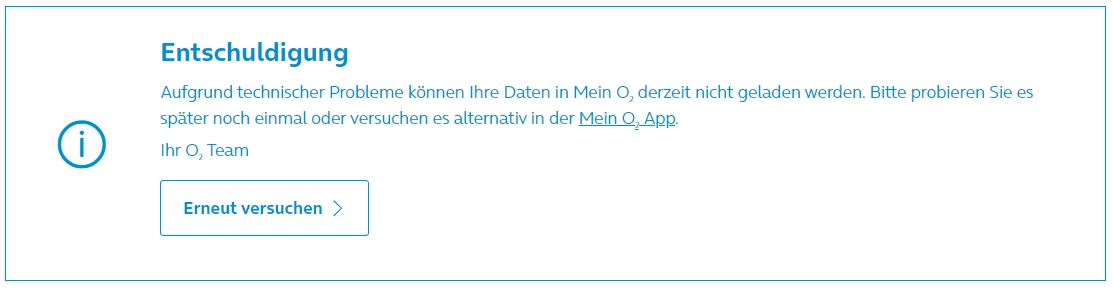 Aktuell gibt es Herausforderungen bei Mein o2 mit verschiedenen Fehlermeldungen, 404, 500; die betrifft sowohl die Webseite als auch die App.