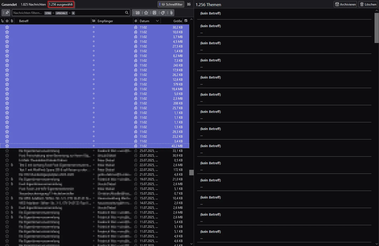 Der Mail Client (Thunderbird) ist ebenfalls verwirrt und zeigt die betroffenen Mails mit aktuellem Datum und Uhrzeit, wenn auch immerhin mit unterschiedlichen Größen an: