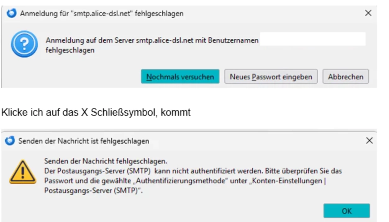 alt smtp.alice-dsl.net  ersetzen durch neu:  smtp.o2mail.de