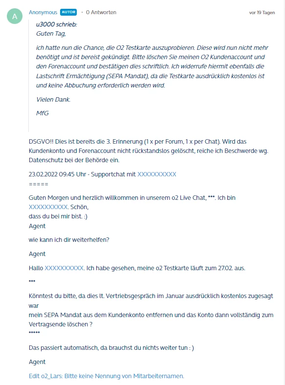 DSGVO: Bitte löschen Sie meinen O2 Account (Vertragskonto + Community)
