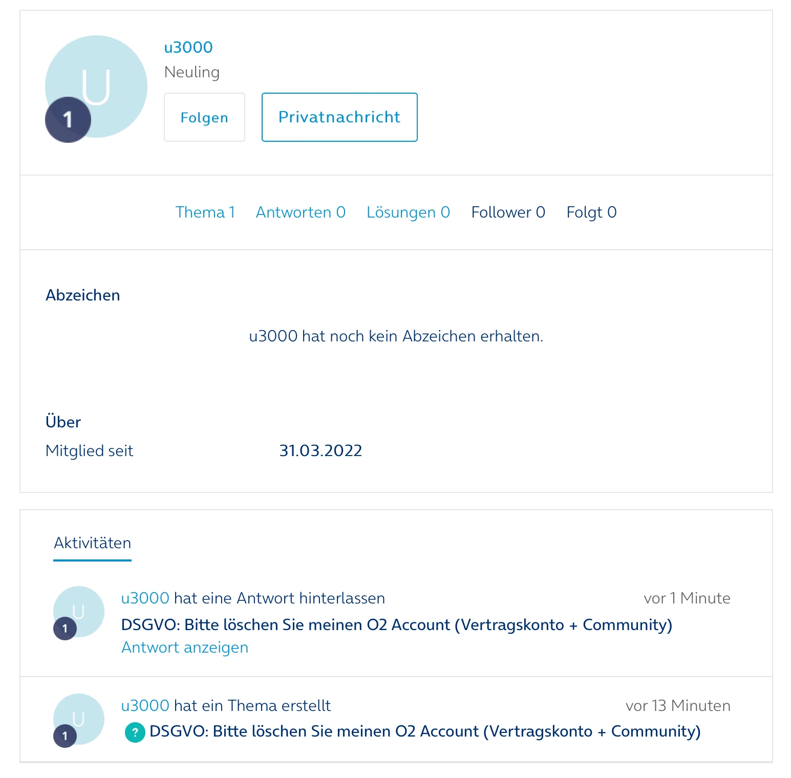 @Sonic28 @Sandroschubert @Castiel Bitte bedenkt eure Reaktion “gefällt mir” noch einmal. Ein Missverständnis , ok, aber wenn sich das Herausstellen sollte, dass hier vorsätzlich meine Daten nicht gelöscht wurden ist das für den Betroffenen Endkunden, in dem Falle mich, nicht gerade erfreulich. Daher BITTE kontaktiert den Accountmanager und löscht den u3000 Account vollständig und nicht nur das Forum. Dort läuft kein Vertrag mehr und wie im anderen Thema bereits zitiert wurde mir die Löschung nach Vertragsablauf auch im Supportchat zugesichert. Dann ist doch wieder alles gut und ich kann wenigstens mit guter Erinnerung an O2 gehen.