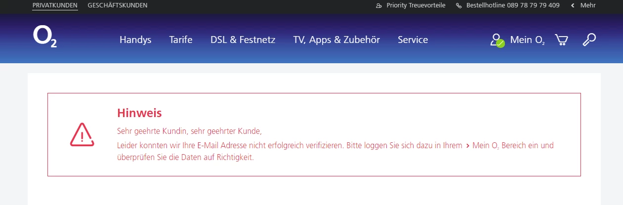 Ich bekam vor ein paar Tagen von o2 eine E-Mail mit einem Bestätigungslink für meine E-Mail-Adresse. Diesen Link kann ich nicht mehr benutzen, weil er abgelaufen ist: