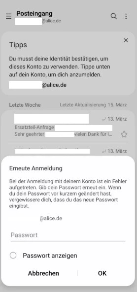 Seit gestern wird eine Neuanmeldung beim Alice E-Mail Konto erwarte. Das gültige Passwort wird jedoch nicht akzeptiert.. Der E-Mail Server lehnt das Passwort ab.