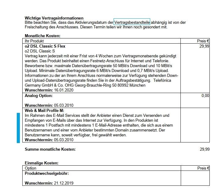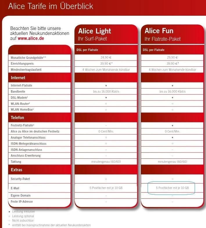 huch ... zur aktuellen Produktbeschreibung zum 16.01.2020, Foto: Dort ist als Vertragsbestandteil der E-Maildienst ausgewiesen mit "mindestens" einem Account - hier bezieht man sich auf den Vertrag vom 05.03.2010, mithin Bestandskunde. Bekanntlich waren es zu diesem Termin 5 Accounts, vgl. Alice-Foto. Zur Vollständigkeit, die Tarifumstellungen erfolgten ausschließlich einseitig von der Firma „o2“ - es gab keinerlei Zustimmungsabfragen oder Auftragserteilungen meinerseits.