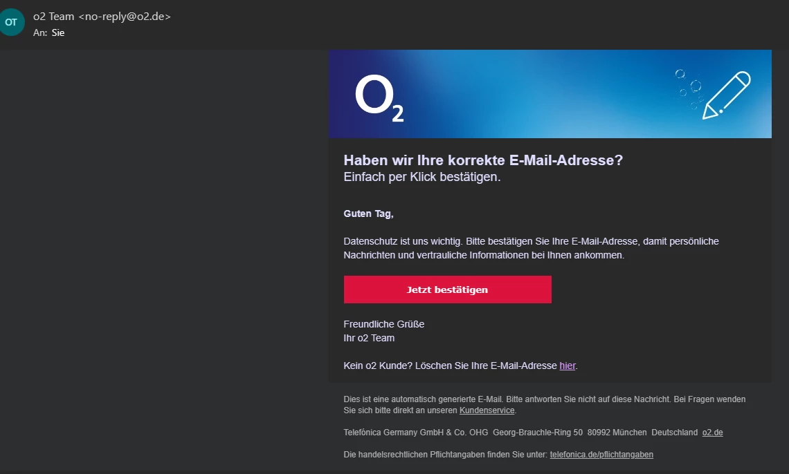 ich bin bereits O2 Kunde im Bereich Internet zuhause, nun habe ich mich noch für einen Mobilfunkvertrag entschieden. Dieser wurde heute auch bestätigt, nun soll ich meine Email verifizieren.