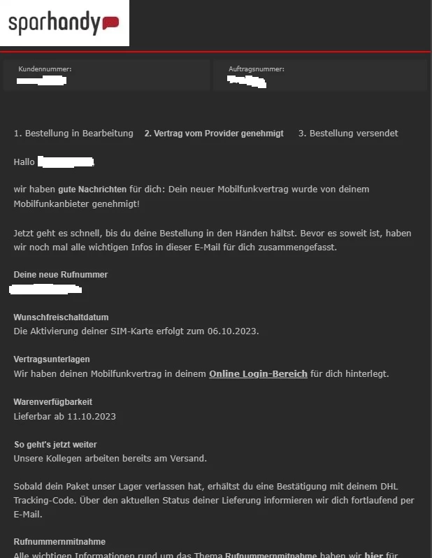 laut Sparhandy.de wurde der Vertrag zu heute aktiviert und auch die Rufnummer wurde mir mitgeteilt, was mich eigentlich auch wundert da das Google Pixel 8 Pro frühestens zum 11.10. ausgeliefert wird. Jedoch erhielt ich die Mitteilung über die Bitte der Verifizierung auch direkt von O2 per Email.